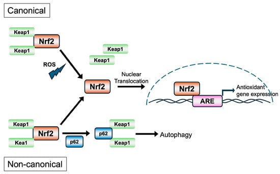 The Nrf2 signaling pathway is a central regulator of cellular redox homeostasis, responding to oxidative and electrophilic stress through transcriptional activation of cytoprotective genes. This highly conserved pathway plays a pivotal role in detoxification, antioxidant defense, inflammation modulation, metabolism, and cell survival. Activation of Nrf2 can occur predominantly through canonical mechanisms in which Keap1 dissociates from Nrf2 under oxidative or electrophilic stress, as well as non-canonical mechanisms in which Keap1 interaction with the autophagy receptor p62/SQSTM1 leads to degradation of Keap1 via autolysosomes [6] (Figure 2). Activation of Nrf2 can also occur through Keap1-independent pathways, as briefly described below.