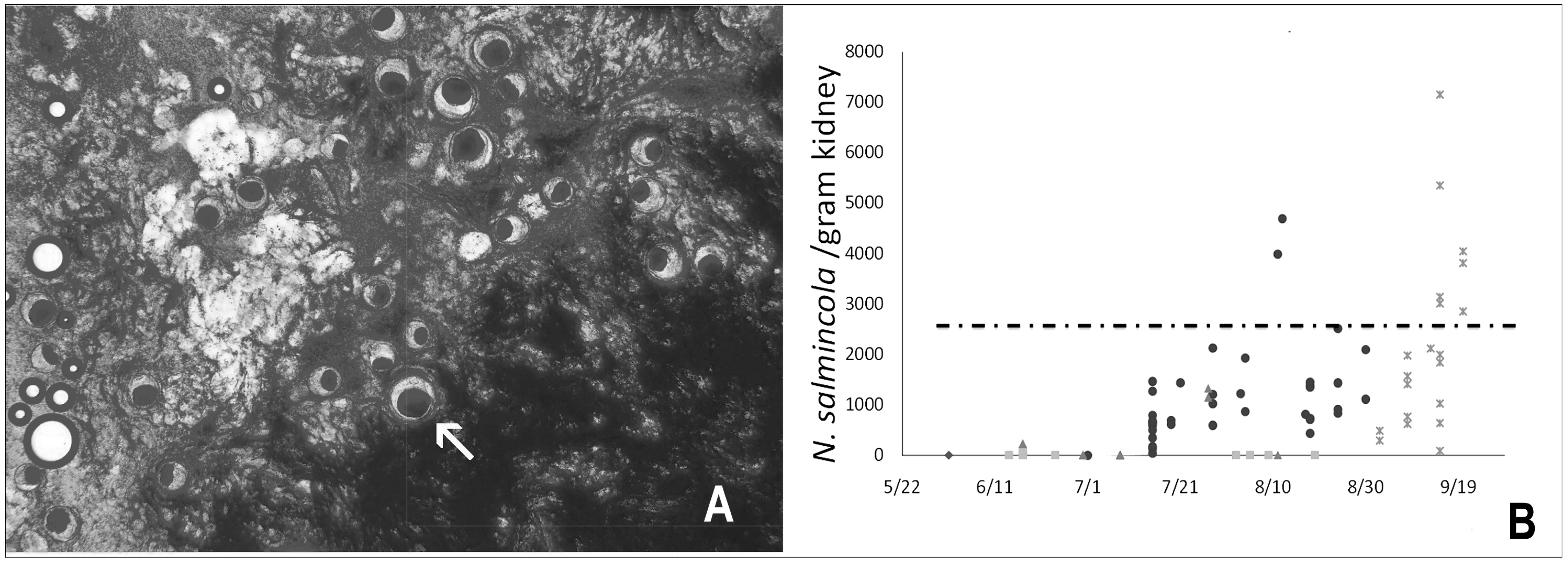| Renibacterium salmoninarum (Bacterial Kidney Disease) | F | R, S, M, Sys | Exophthalmia, skin petechia, ascites, pericardial effusion, granulomas, splenomegaly | CA, WA, OR, BC, AK | ✓ * | |