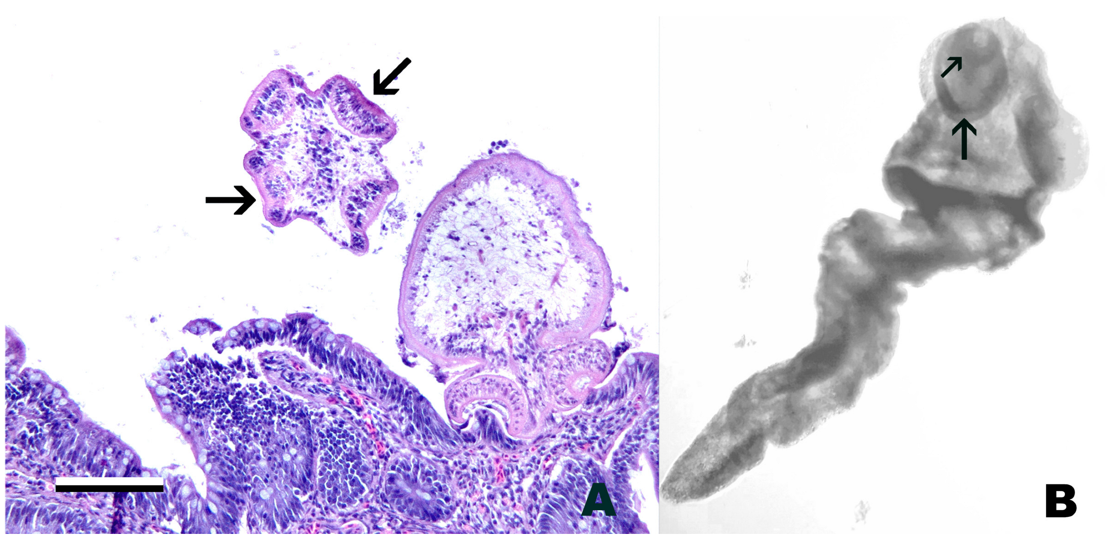 - Kent, M.L.; Margolis, L.; Fournie, J.W. A New Eye Disease in Pen-Reared Chinook Salmon Caused by Metacestodes of Gilquinia squali (Trypanorhyncha). J. Aquat. Anim. Health 1991, 3, 134–140. [Google Scholar] [CrossRef]