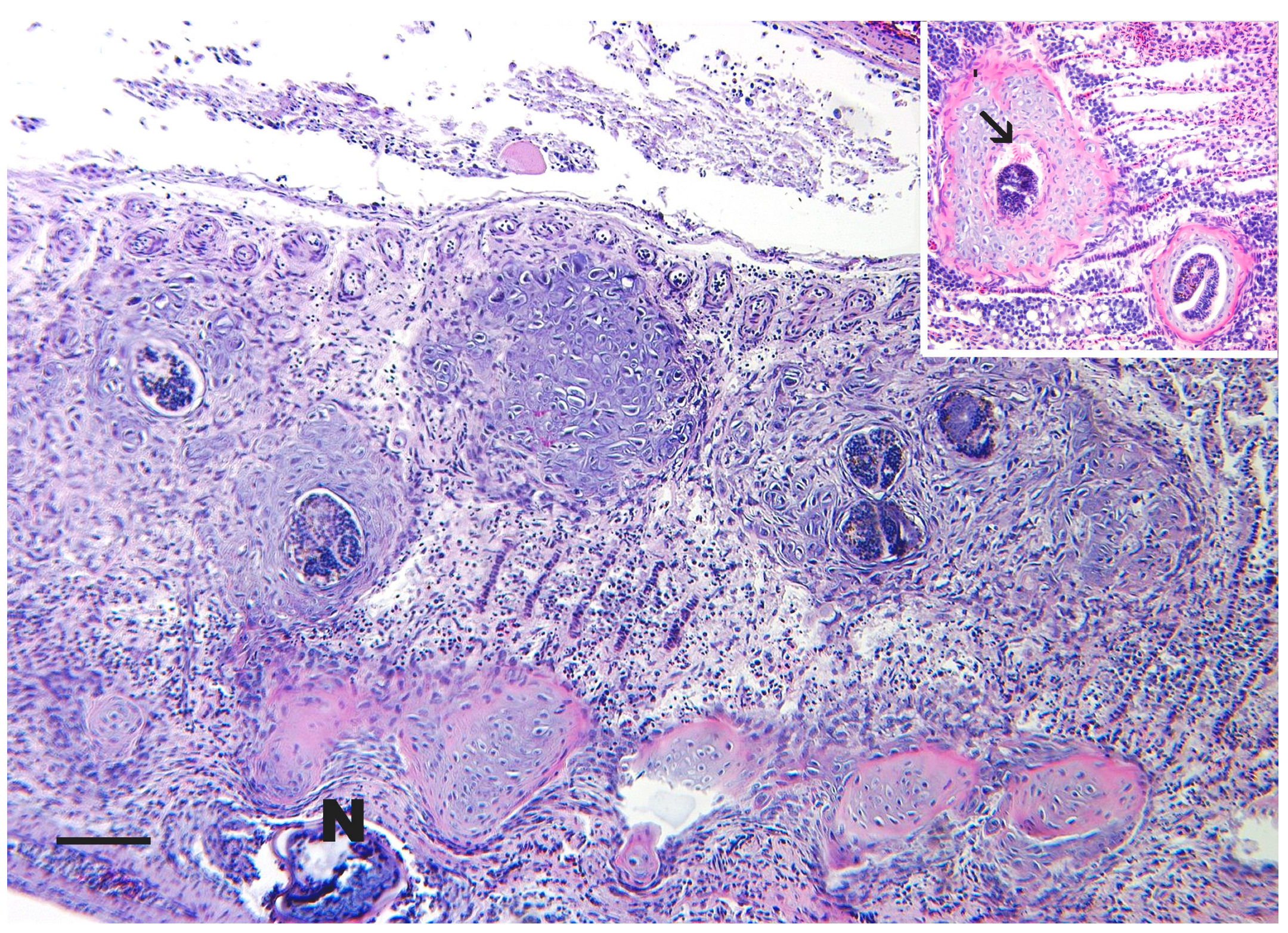 | Myxobolus squamalis | CO, CU | F | I | Dermal cysts, secondary infections | CA, OR, ID, WA, BC, AK | |