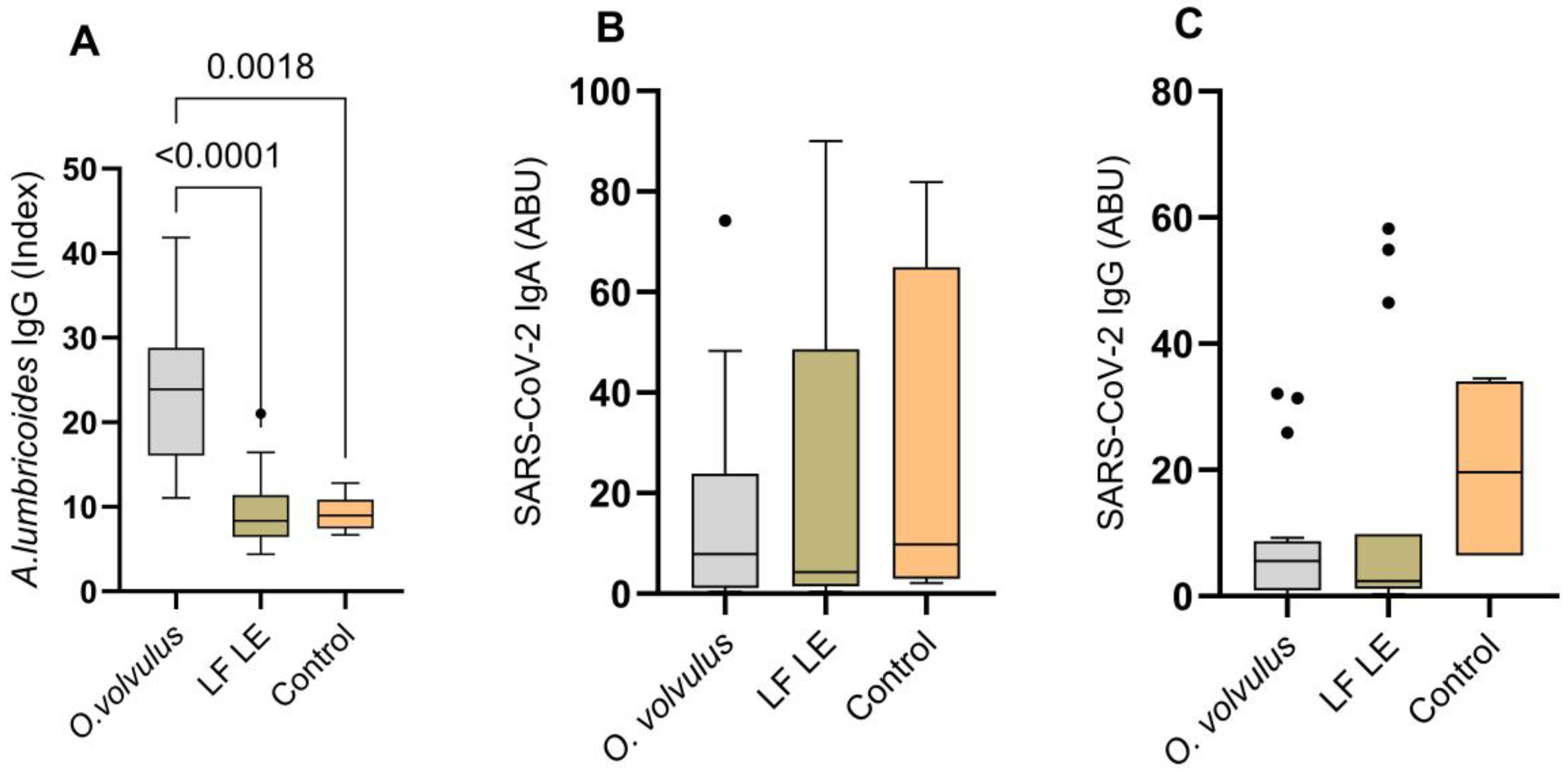 - Adjobimey, T.; Meyer, J.; Hennenfent, A.; Bara, A.J.; Lagnika, L.; Kocou, B.; Adjagba, M.; Laleye, A.; Hoerauf, A.; Parcina, M. Negative Association between Ascaris Lumbricoides Seropositivity and Covid-19 Severity: Insights from a Study in Benin. Front. Immunol. 2023, 14, 1233082. [Google Scholar] [CrossRef] [PubMed]