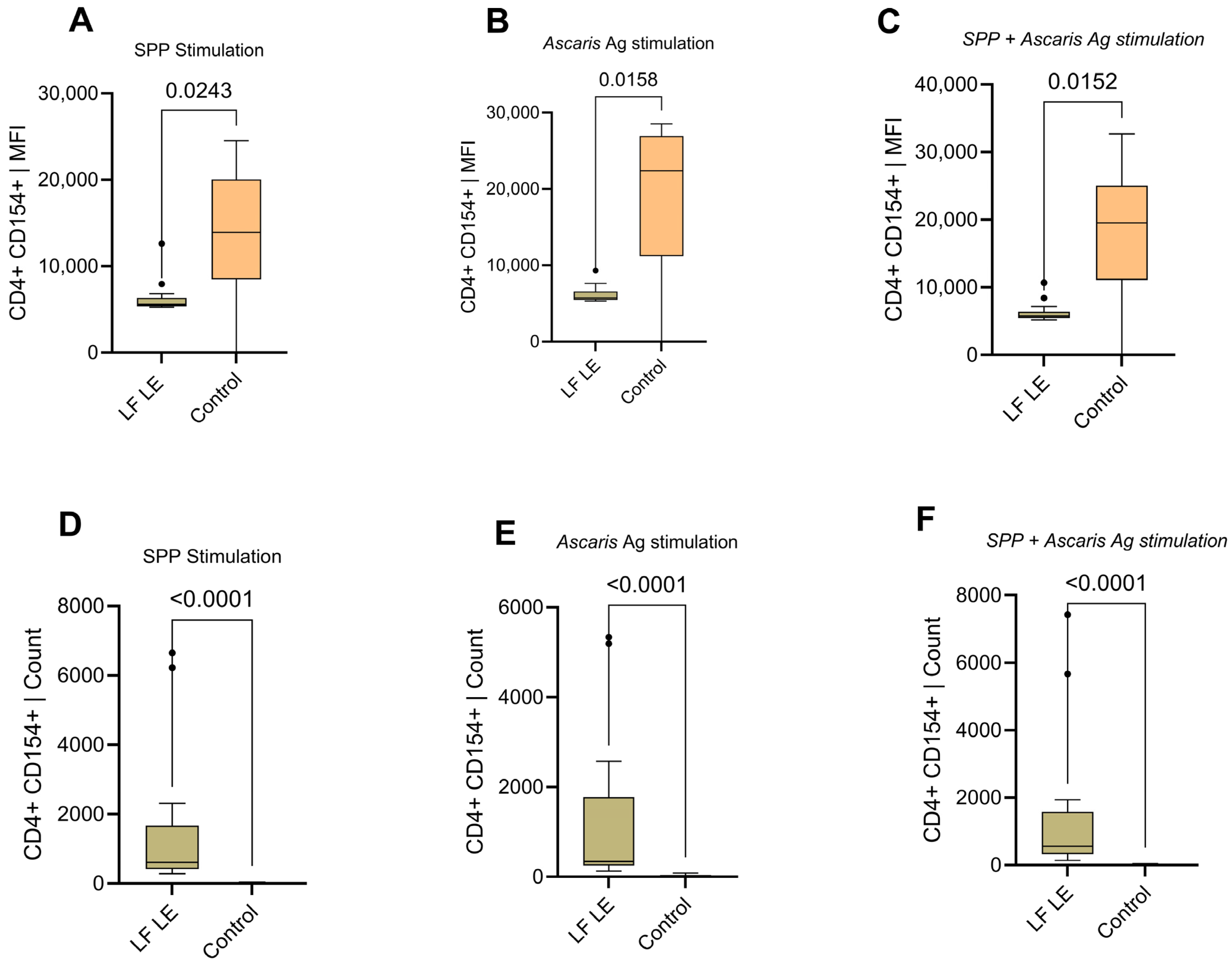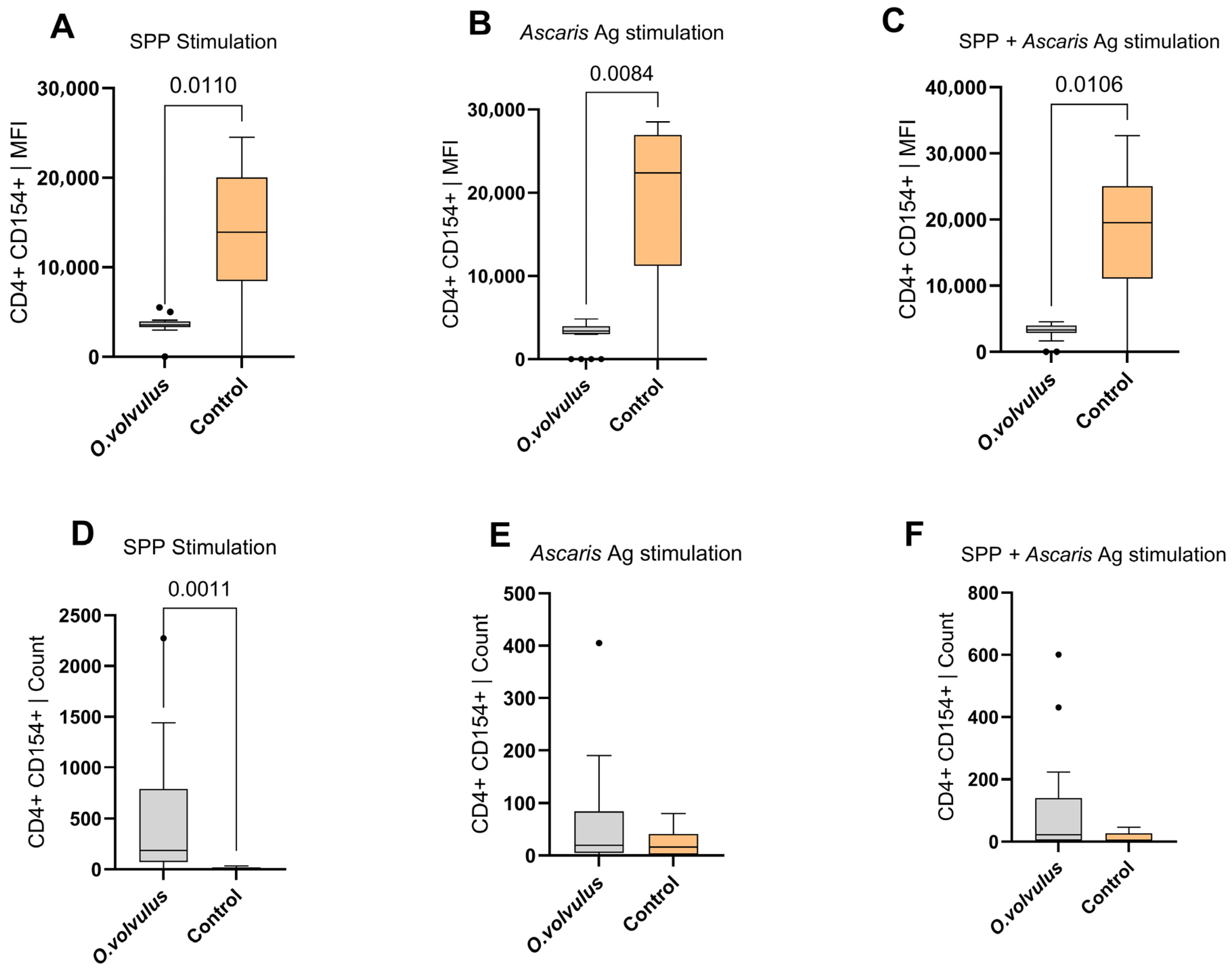 3.4. Downregulation of CD154 on CD4+ T Lymphocytes in O. volvulus-Infected Participants