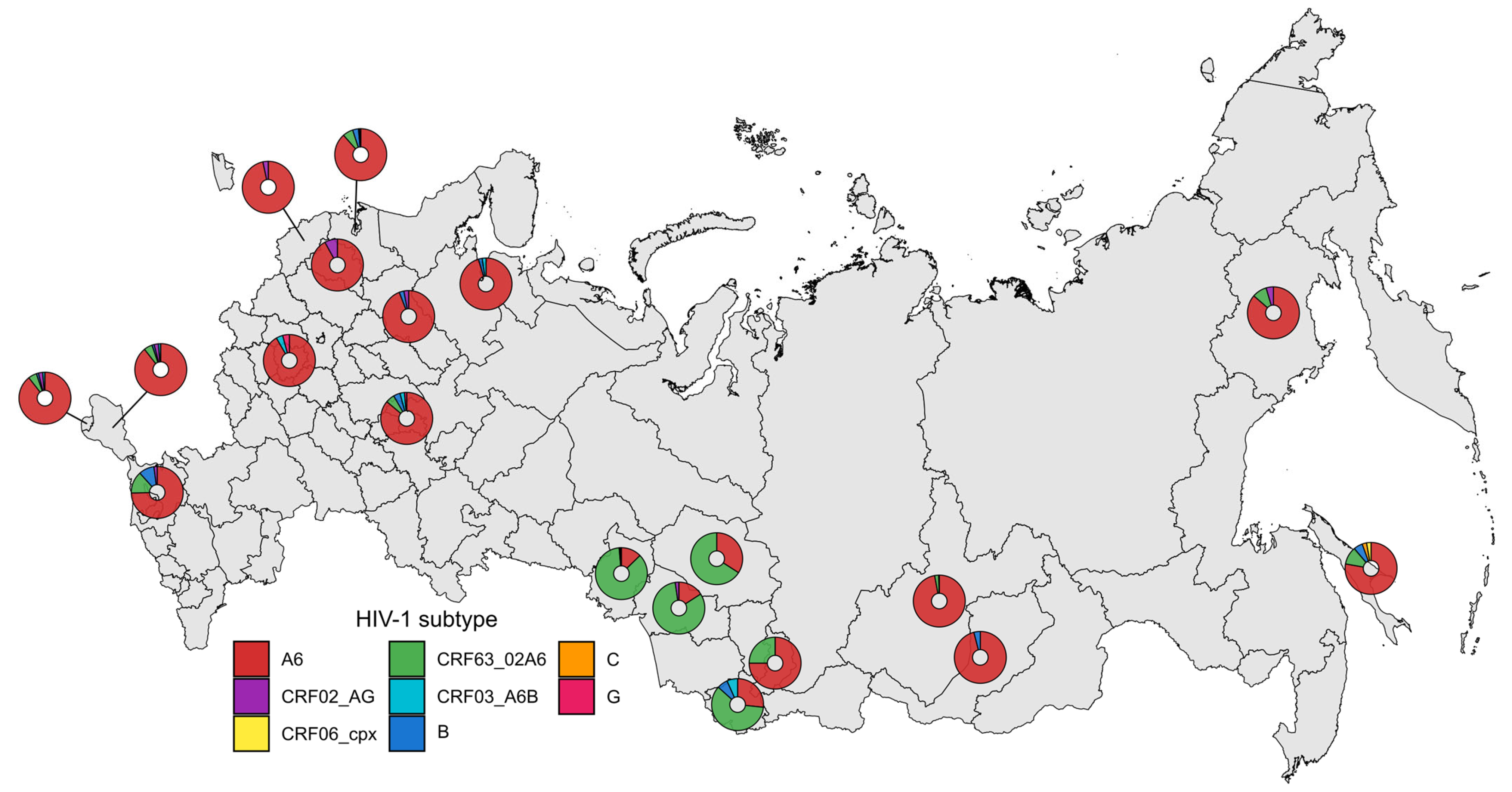 - Ogarkova, D.; Antonova, A.; Kuznetsova, A.; Adgamov, R.; Pochtovyi, A.; Kleimenov, D.; Tsyganova, E.; Gushchin, V.; Gintsburg, A.; Mazus, A. Current Trends of HIV Infection in the Russian Federation. Viruses 2023, 15, 2156. [Google Scholar] [CrossRef] [PubMed]