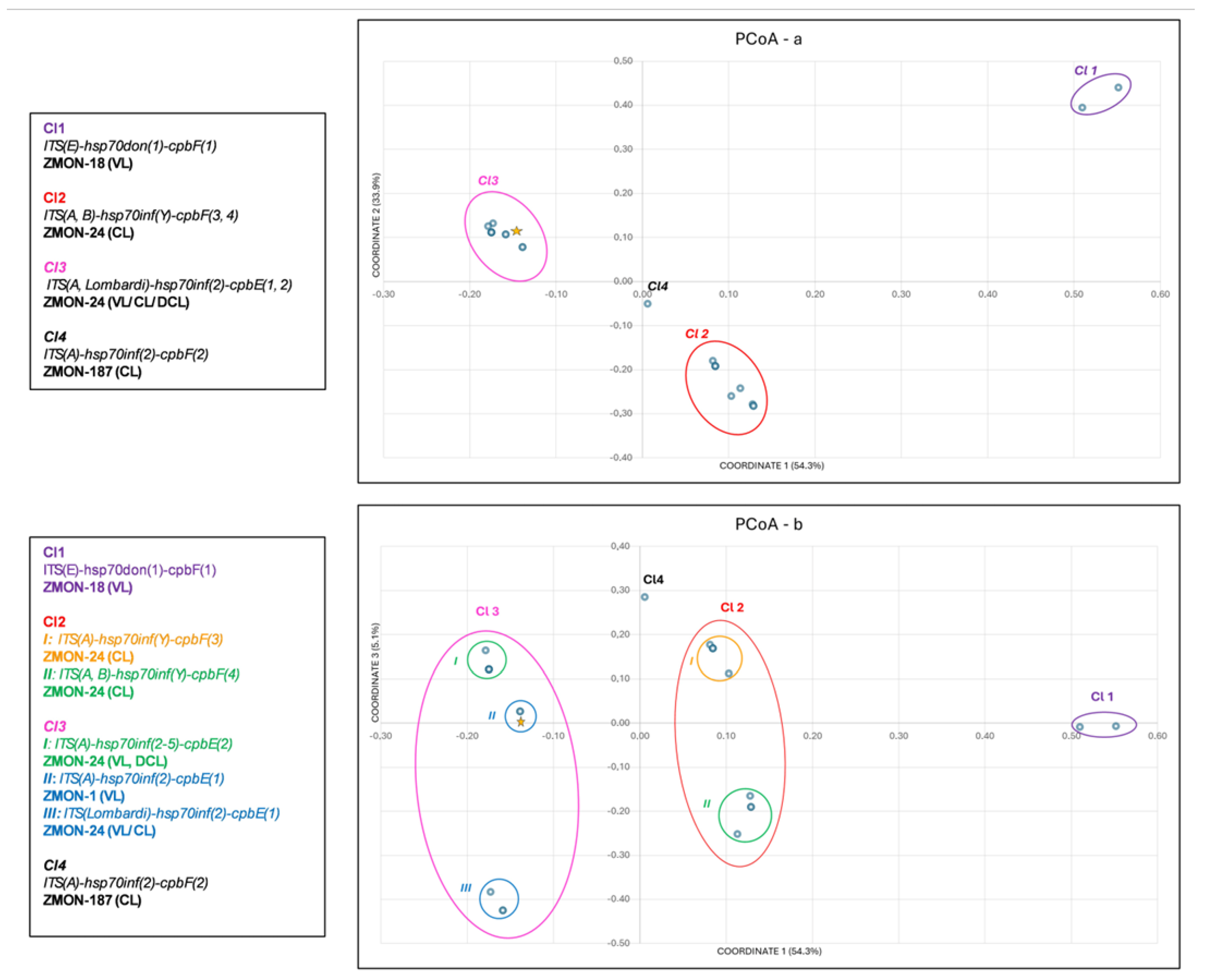 | Sequence Variant ITS/hsp70/cpb | Genotype | ZMON | Clinic | Origin | N. Strains |