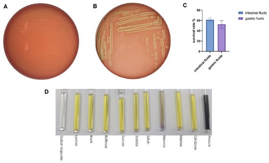 The survival during digestive transit was tested with artificial gastric and intestinal fluids, which is a widely used in vitro surrogate endpoint to determine tolerance to simulated gastrointestinal conditions [23]. The survival during digestive transit was tested with artificial gastric and intestinal fluids, which are widely used in vitro surrogate endpoints to determine tolerance to simulated gastrointestinal conditions [22]. LA-V4 survived the two challenges with a survival rate of 52.5 ± 7.4 in artificial gastric juice and 61.1 ± 3.7 in artificial intestinal juice (Figure 3C). Blood agar screening on safety revealed distinct β-hemolysis surrounding the S. aureus positive control and γ-hemolysis in LA-V4 (no hemolytic reaction detected) and no clearing zone around colonies (Figure 3A,B). In addition, micro-biochemical profiling revealed a generalized pattern of carbohydrate use. LA-V4 fermented/assimilated several carbon sources, such as lactose, inulin, raffinose, sucrose, sorbitol, salicin, mannitol, maltose, cellobiose, and esculin (Figure 3D; Table 1), and failed to hydrolyze sodium hippurate (Table 1).