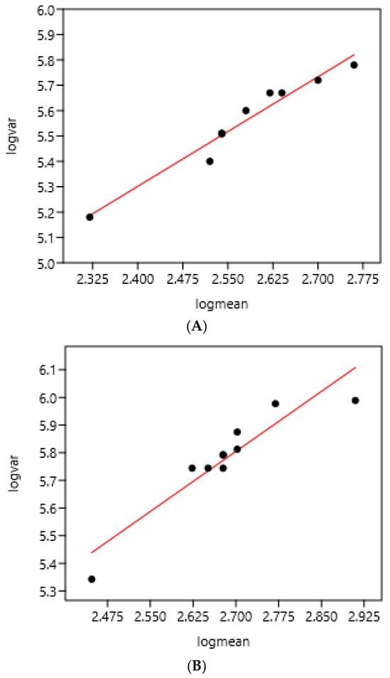 The tendency of population density to vary as a power function of the mean was first observed in the field of ecology [8]. Since then, this concept has been extended to all complex systems, including physics (where it is known as fluctuating scaling), climatology, the stock market, and the life sciences [32]. Adult parasite species and their propagules interact with each other and their hosts in complex ways [33]. TPL has been found applicable to fecundity (FEC) in horses’ GIN, as it was to adult GIN in sheep [7] and other ruminants [11]. In the latter study, TPL was evaluated in the FEC of only two species (Nematodirus and Marshallagia), which have easily identifiable eggs. The slope of the regression of variance to mean was shown to be similar for FEC data and adult parasites with Marshallagia but lower with Nematodirus. While there are probably some differences between FEC and adult parasite counts, these are not very significant; the slope values were close to 2 for sheep [7], 1.7 in several species of ruminant [11], and 1.76 for our current FEC in horses.