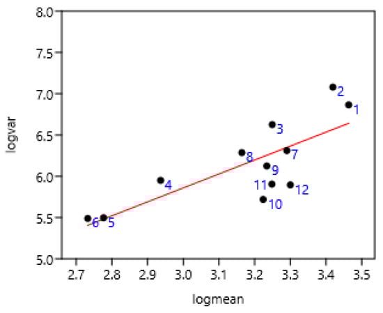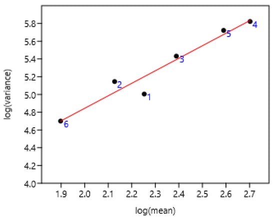 Relationship between variance and mean among different categories of horses in Poland. 1 Gelding (n = 281), 2 stallion (n = 2072), 3 mare (n = 6648), 4 two years (n = 1379), 5 yearling (n = 1865), 6 foal (n = 357). log (var) = 2.03 + 1.41 log (mean); r = 0.97 n = 6 p = 0.001.