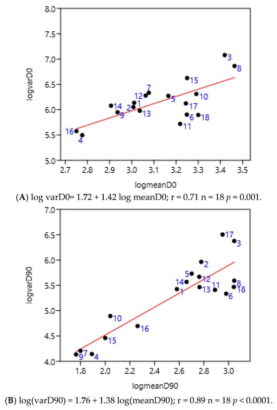 There was no significant difference between before and after 90 after treatment days (Figure 6A,B). The numbers corresponded to the different anthelmintic treatments in the farms. The positions of farms treated with benzimidazoles (from 14 to 18), for example, were not grouped either before or after treatment. The treatment with different anthelmintics did not influence the value of the slope of the linear regression of variance to mean: 1.38 vs. 1.42.