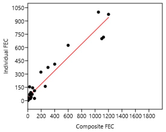 Relation between mean composite and individual faecal egg counts (FECs) in France 1 and 3. A regression on logarithm transformed data was also significant: log (individual FEC) = 0.82 + 0.42 log (composite FEC) n = 28; r = 0.95; p < 0.001. Individual FEC = 37 + 0.75; composite FEC n = 28 r = 0.96 p < 0.001.