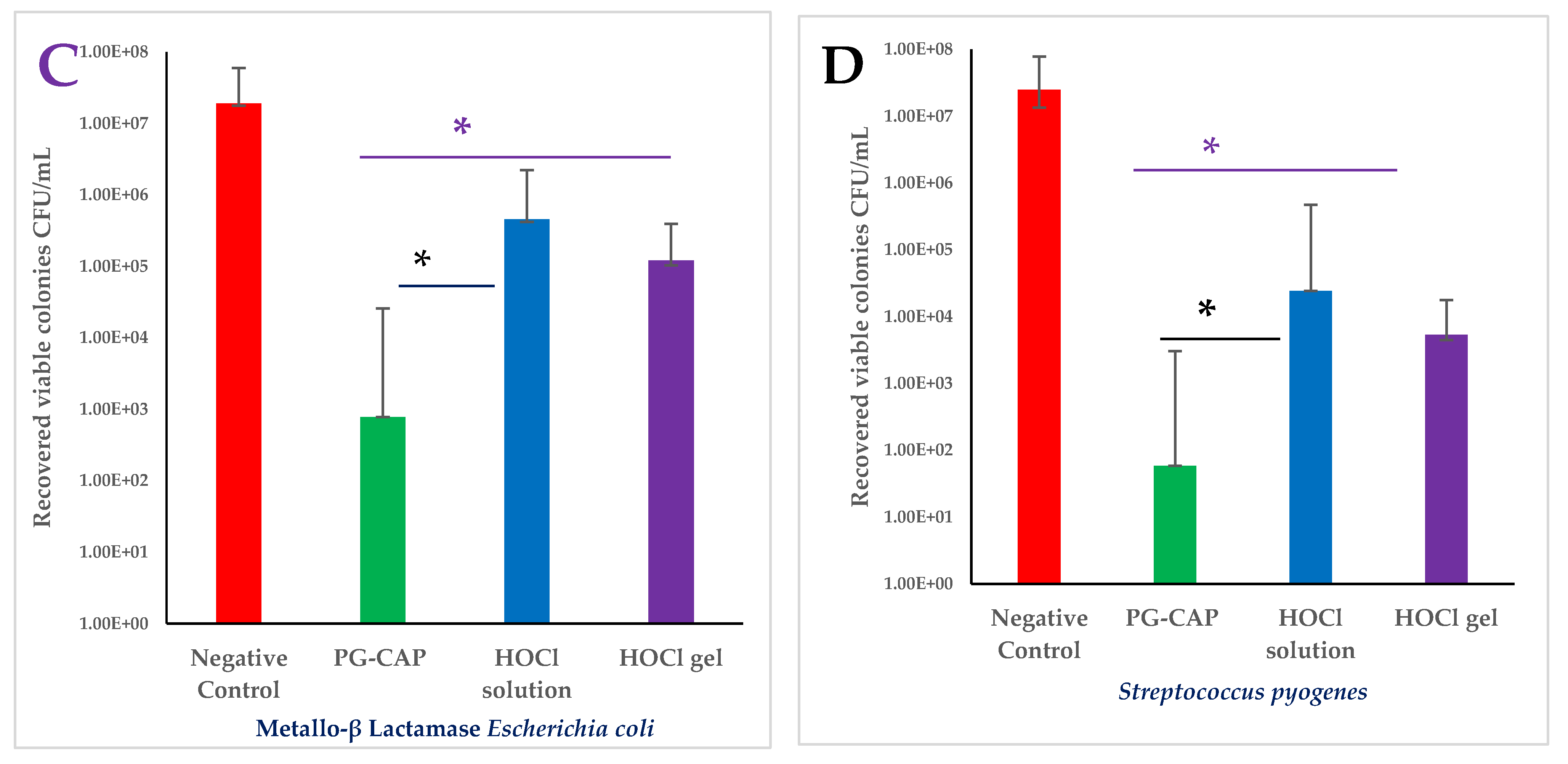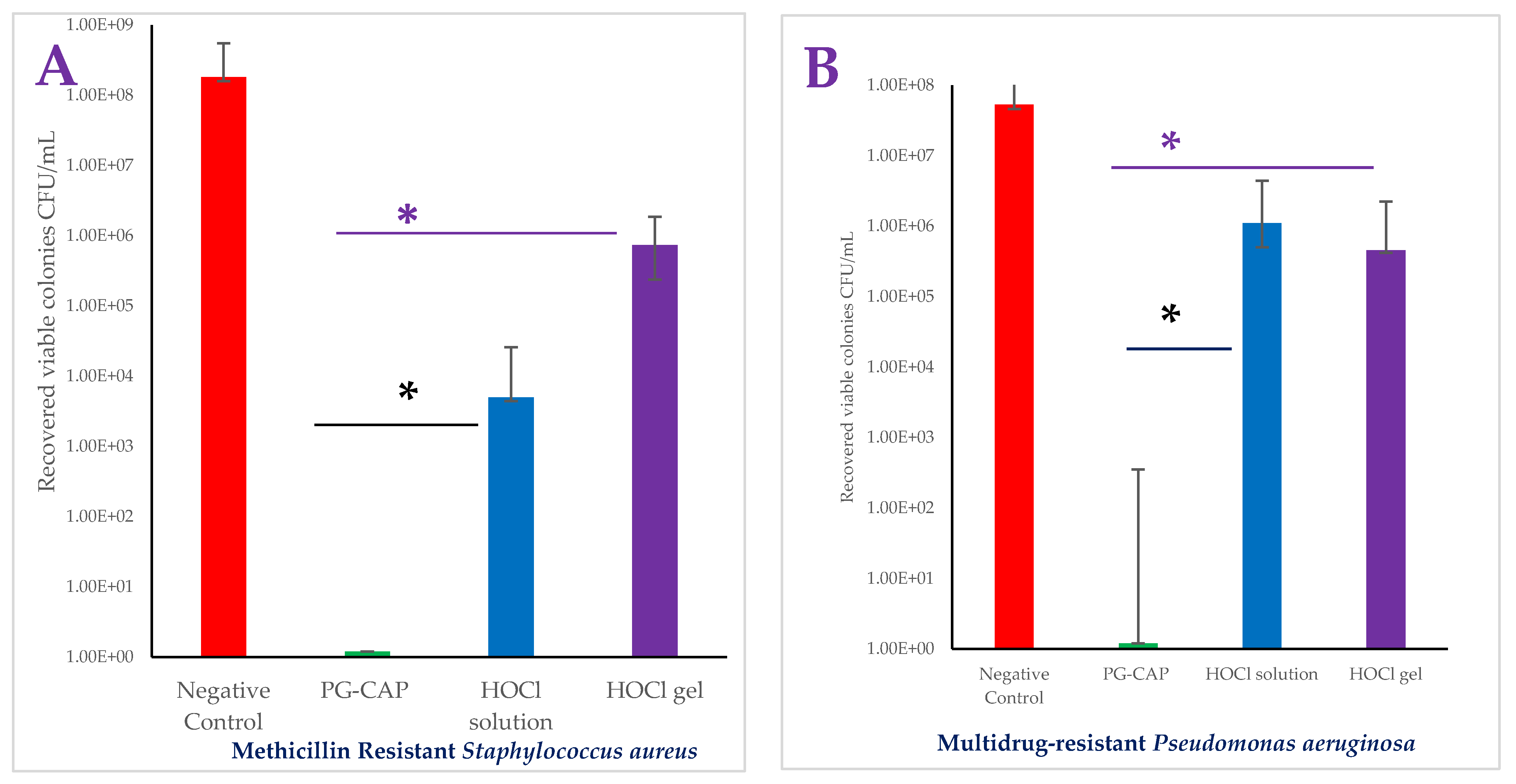 - Palau, M.; Muñoz, E.; Lujan, E.; Larrosa, N.; Gomis, X.; Len, E.M.O.; Almirante, B.; Colominas, A.J.S.; Gavald, J. In vitro and in vivo antimicrobial activity of hypochlorous acid against drug-resistant and biofilm-producing strains. Microbiol. Spectr. 2022, 10, e0236522. [Google Scholar] [CrossRef]