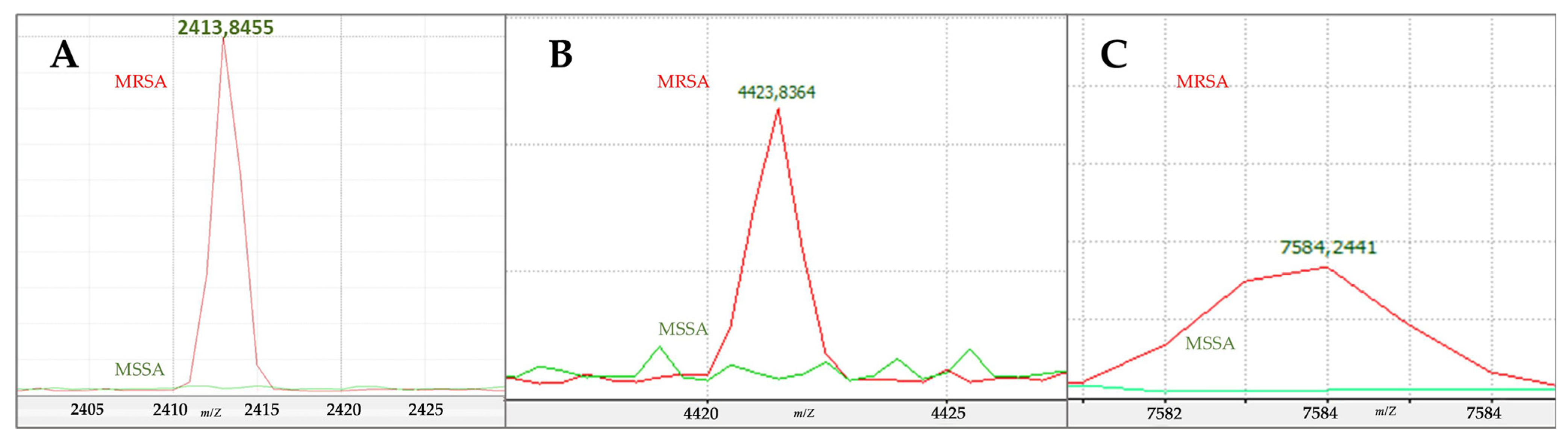 - Santos, P.; Alho, I.; Ribeiro, E. MALDI-TOF MS Biomarkers for Methicillin-Resistant Staphylococcus aureus Detection: A Systematic Review. Metabolites 2025, 15, 540. [Google Scholar] [CrossRef] [PubMed]