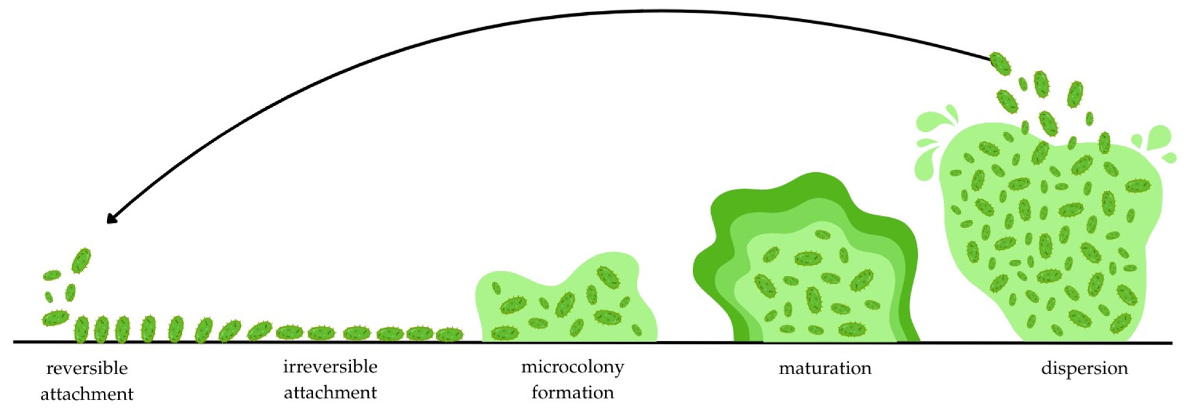 - Sauer, K.; Stoodley, P.; Goeres, D.M.; Hall-Stoodley, L.; Burmølle, M.; Stewart, P.S.; Bjarnsholt, T. The Biofilm Life Cycle: Expanding the Conceptual Model of Biofilm Formation. Nat. Rev. Microbiol. 2022, 20, 608–620. [Google Scholar] [CrossRef]