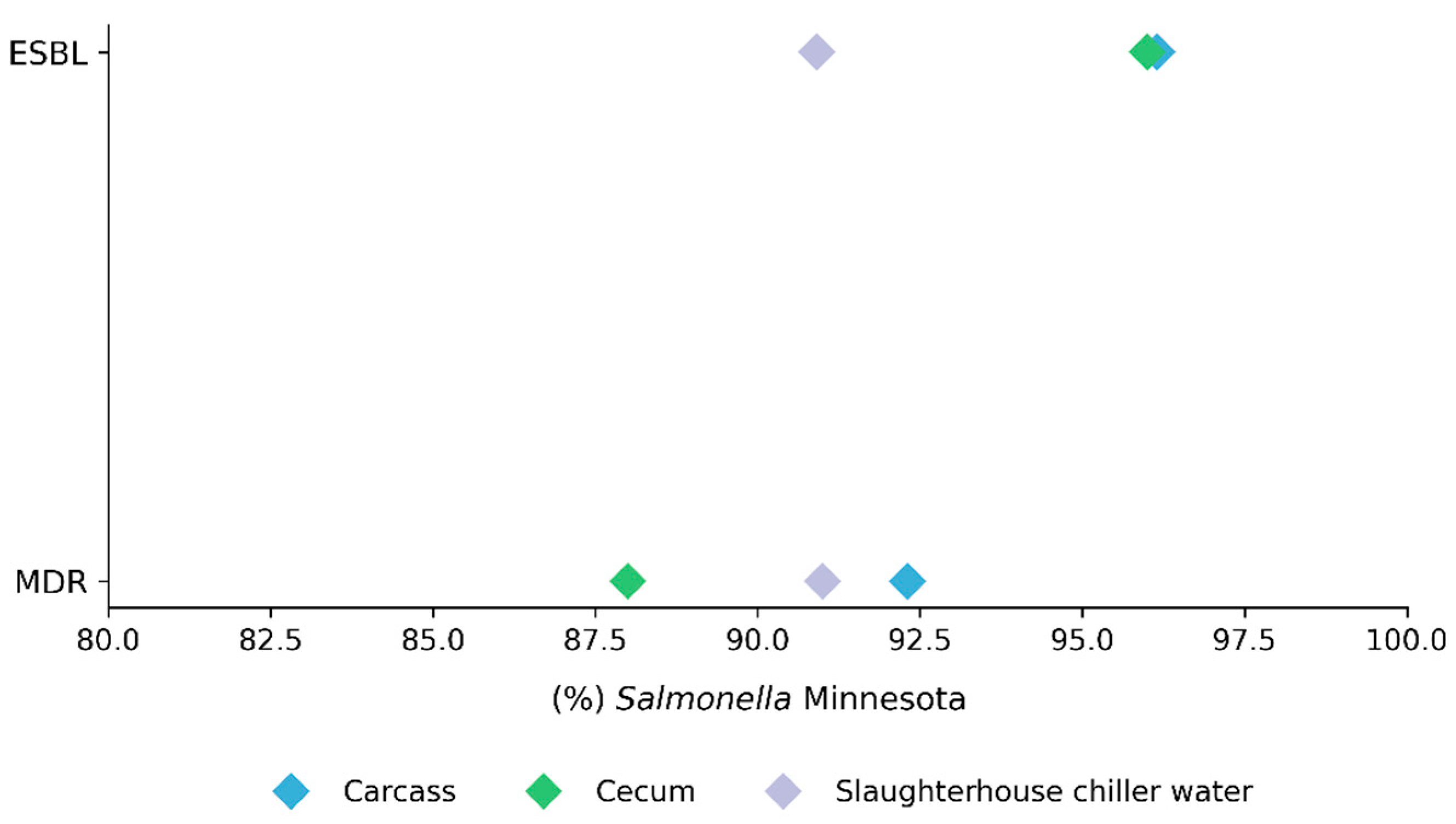 | Carcass % (n/N) | Cecum % (n/N) | Slaughterhouse Chiller Water % (n/N) | ||