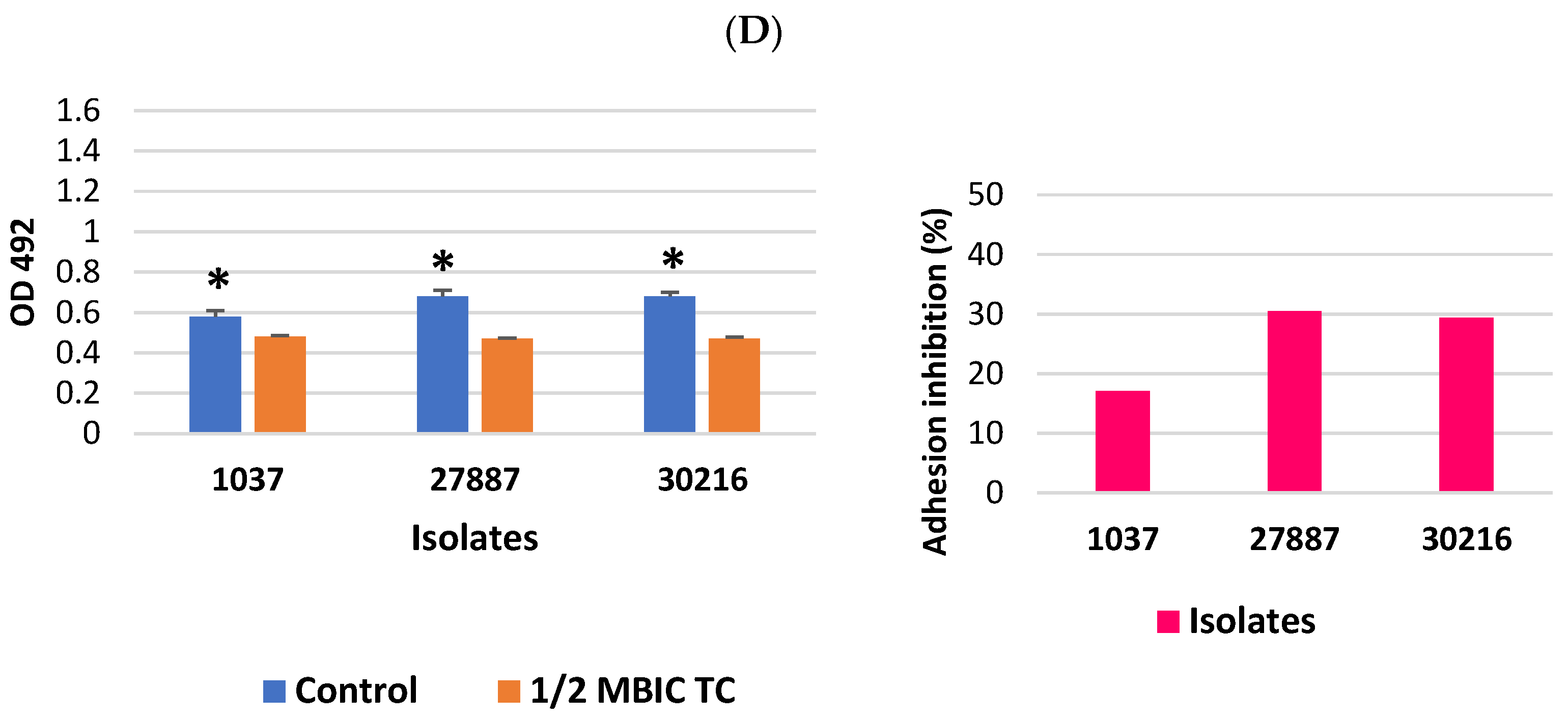 3.1. Inhibitory Effect of TC on Adhesion of MRSA Biofilm Cells to Proteins Present in the Host Plasma and Extracellular Matrix