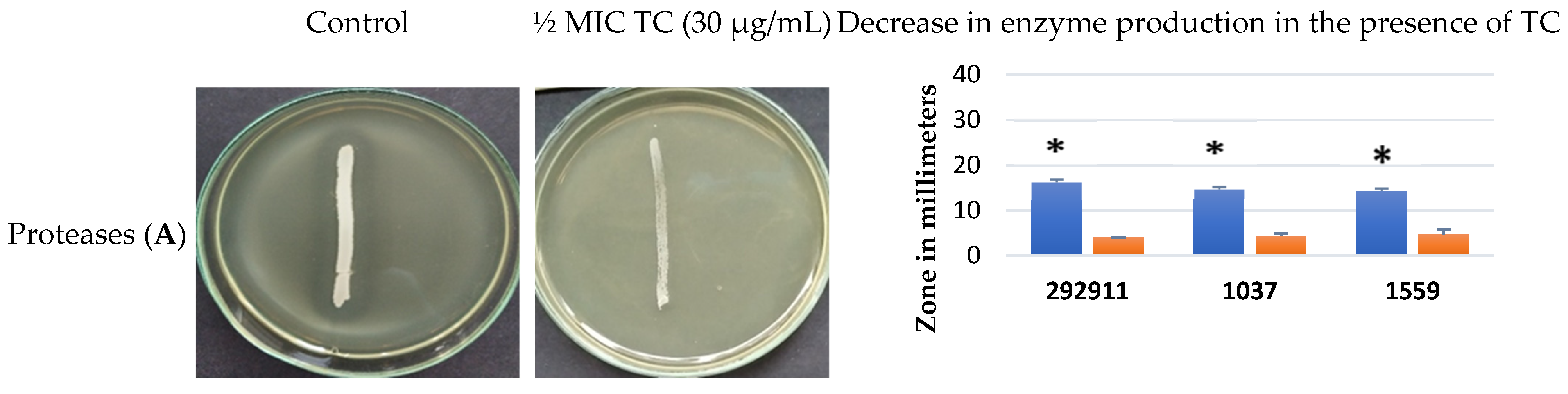 3.2. Inhibitory Effect of TC on Enzyme Production by MRSA Isolates