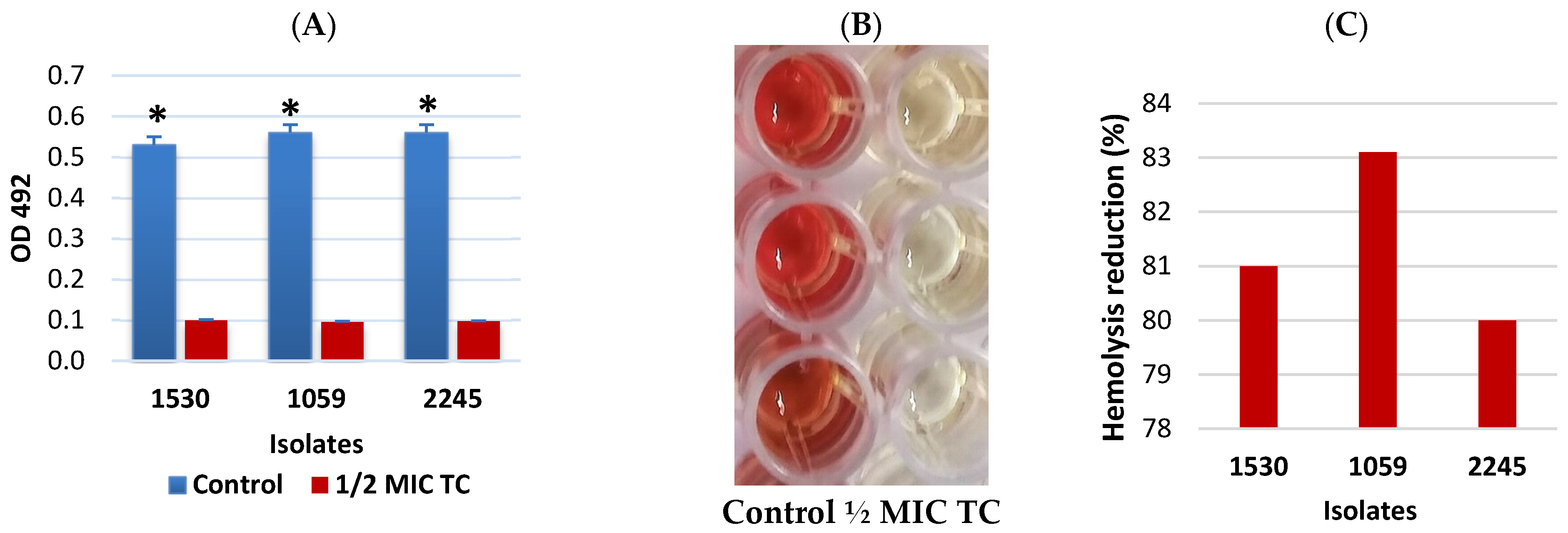 3.3. Inhibitory Effect of TC on Hemolytic Activity of MRSA Isolates