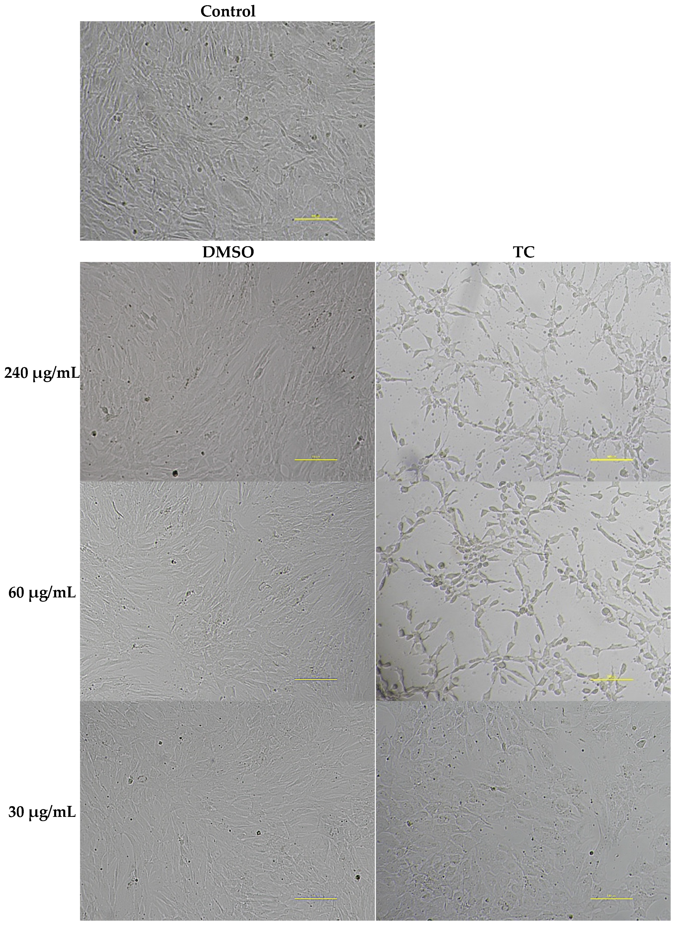 2.4. Cytotoxicity Study of TC on Human Fibroblast Cell Culture In Vitro