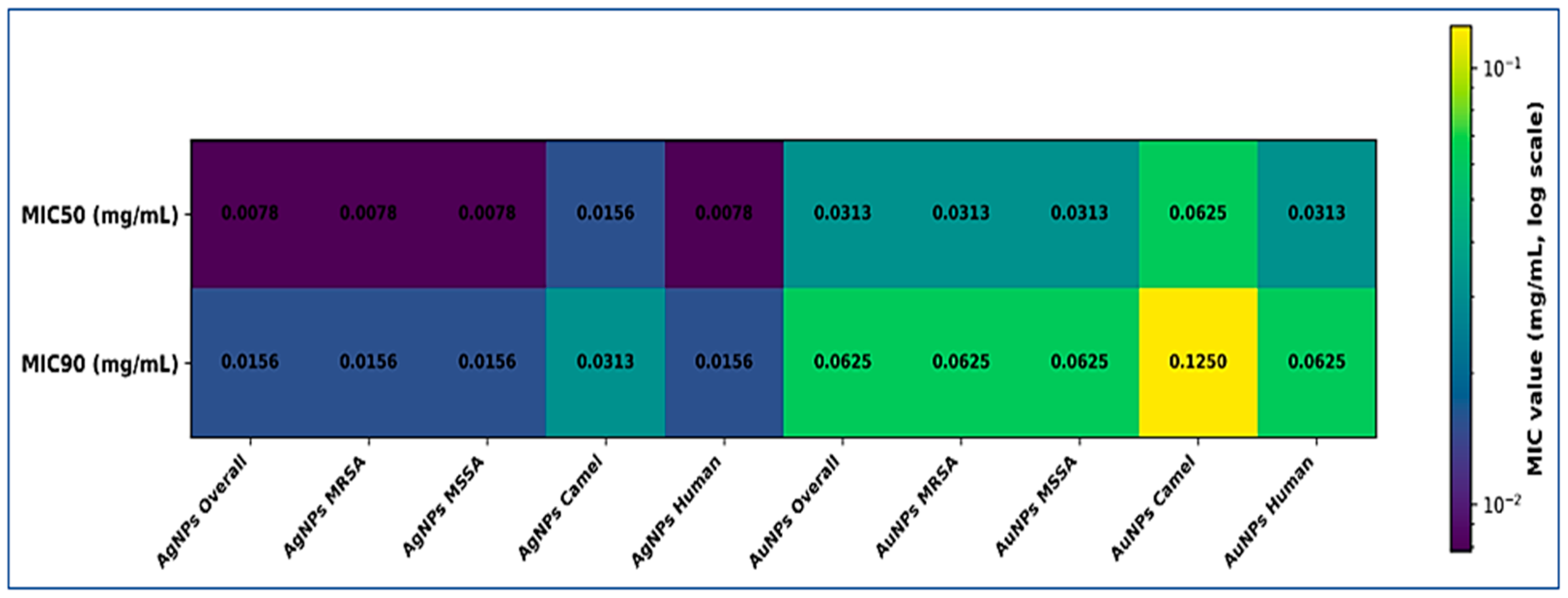 | C1 | Camel | MRSA | AgNPs | 0.0039 | 0.0078 | 2-fold | 0.0039 | No |