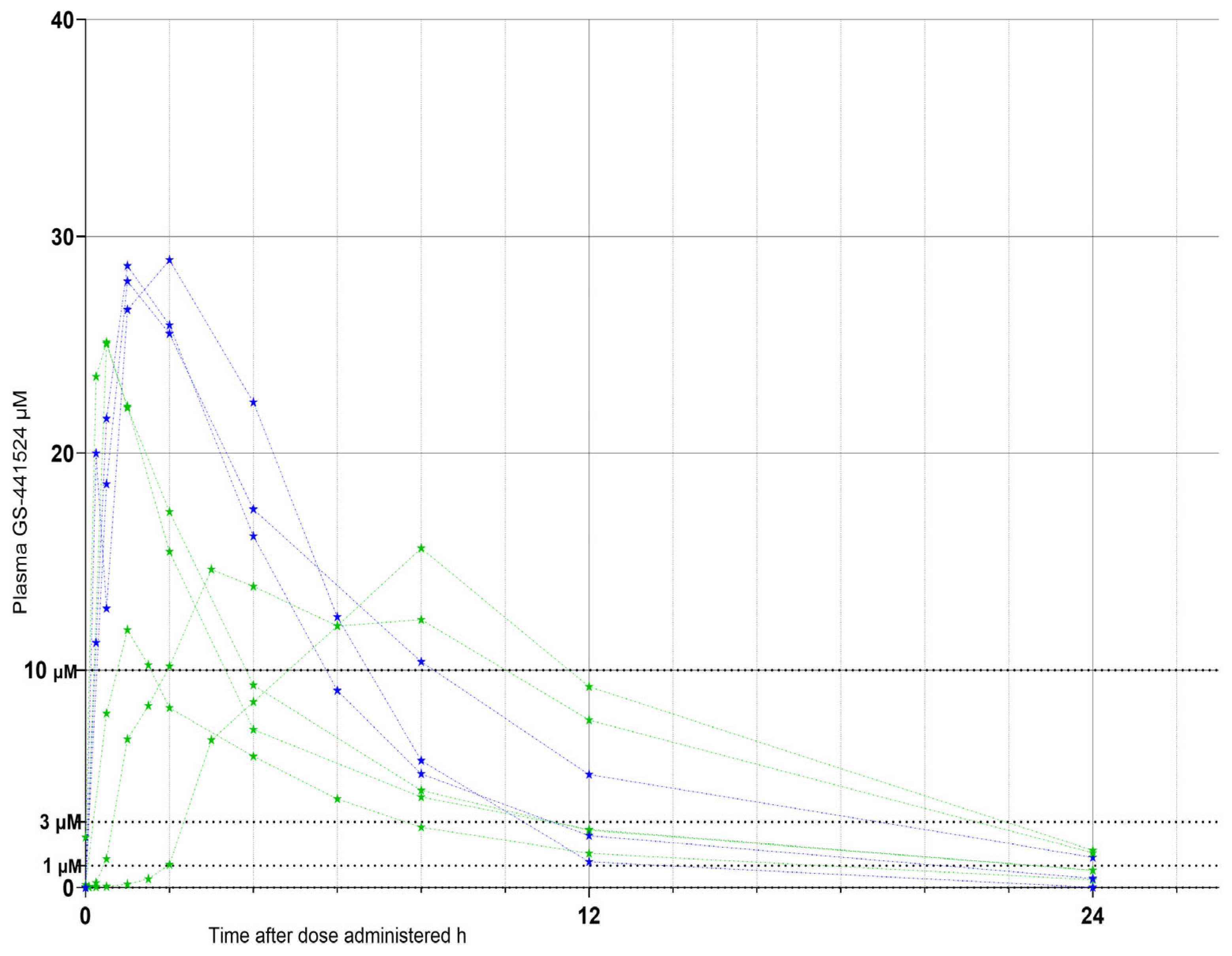 The plasma concentration of GS-441524 (GS-44) in healthy cats administered either remdesivir (REM) or GS-44 at a (normalized) dose of 20 mg/kg, at time = 0, with sequential blood samples assayed for GS-44 (µM) and plotted as concentration vs. time. The drug was administered subcutaneously (blue dotted lines & stars) or orally (green dotted lines & stars). Breakpoint concentrations of 1 µM, 3 µM, and 10 µM were added to provide an indication of the accepted effective concentration values (rounded up to whole numbers) (black horizontal dotted lines) for the inhibition of FIPV RNA replication in vitro and in vivo. Data extracted by digitization from published data [
