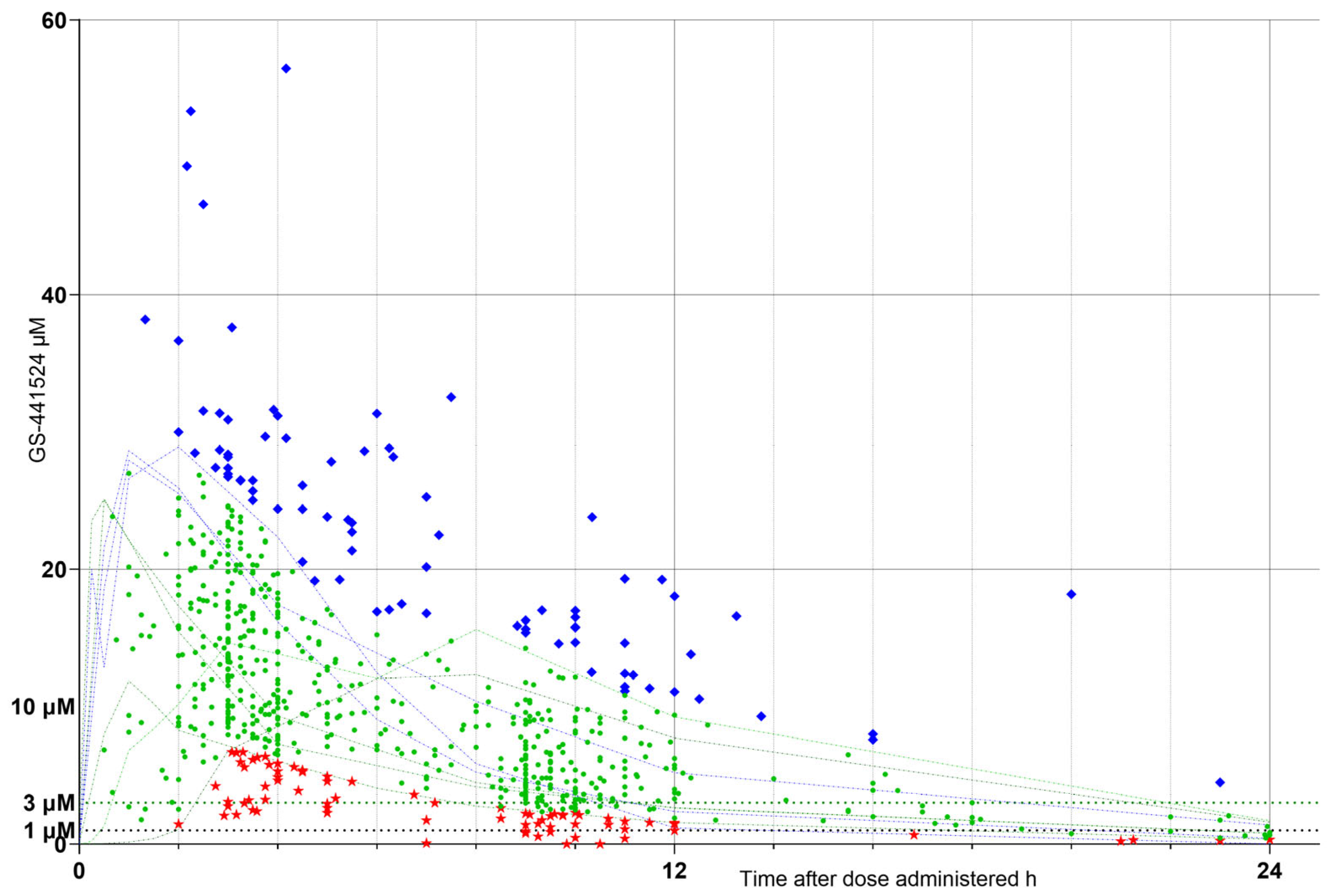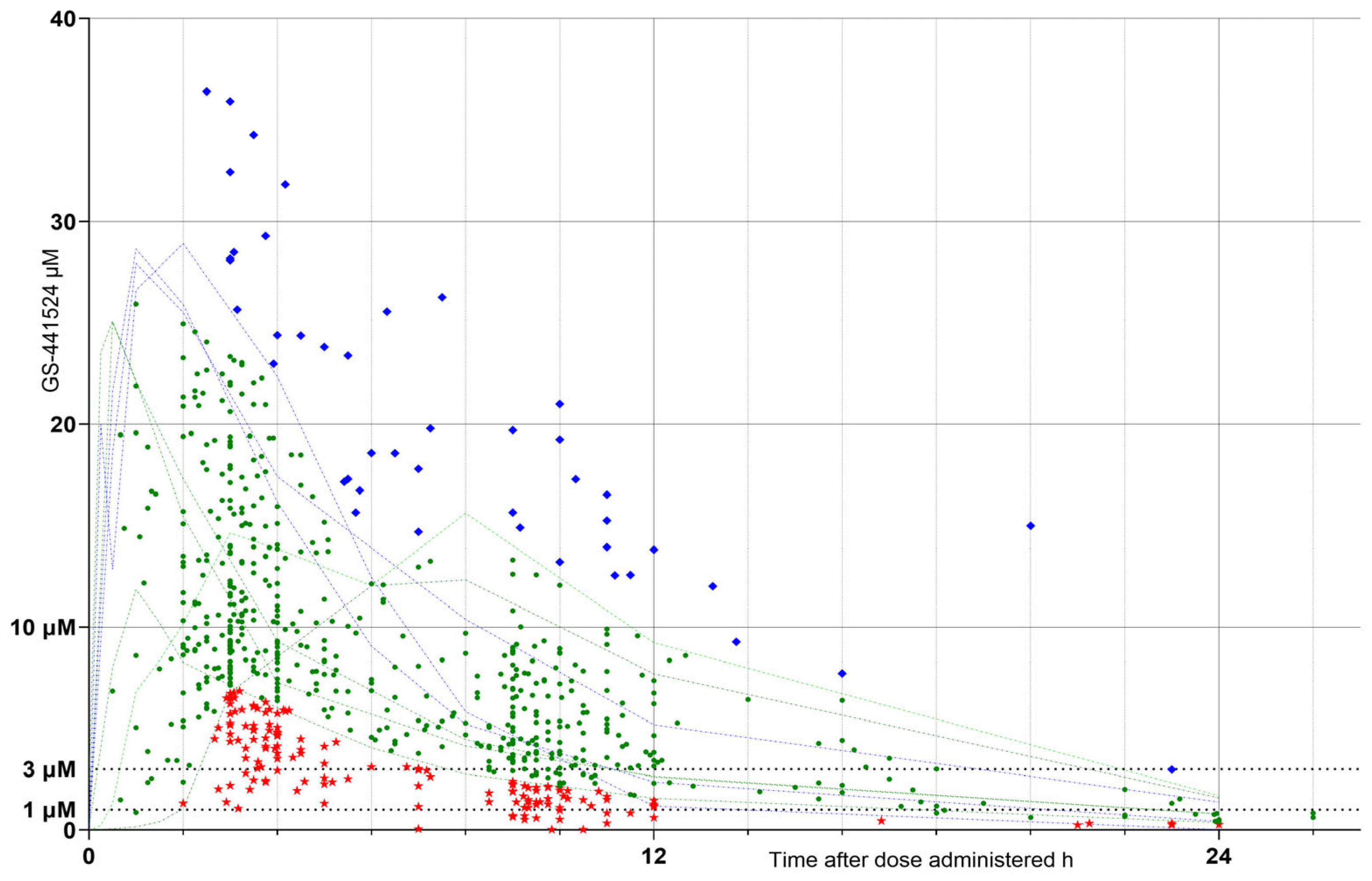 Sample GS-441524 concentration (µM) vs. time (h) after each dose administered. Sample values (“raw” results) falling outside and below the healthy cat response ranges = low raw response cohort (LOW raw RC), red stars; those falling within the healthy cat response ranges = optimum raw (OPT raw RC), green circles and those falling outside and above the healthy cat response ranges = high raw (HIGH raw RC), blue diamonds. Faint green and blue dotted lines indicate data obtained from healthy cat responses, extracted by digitization of published data [