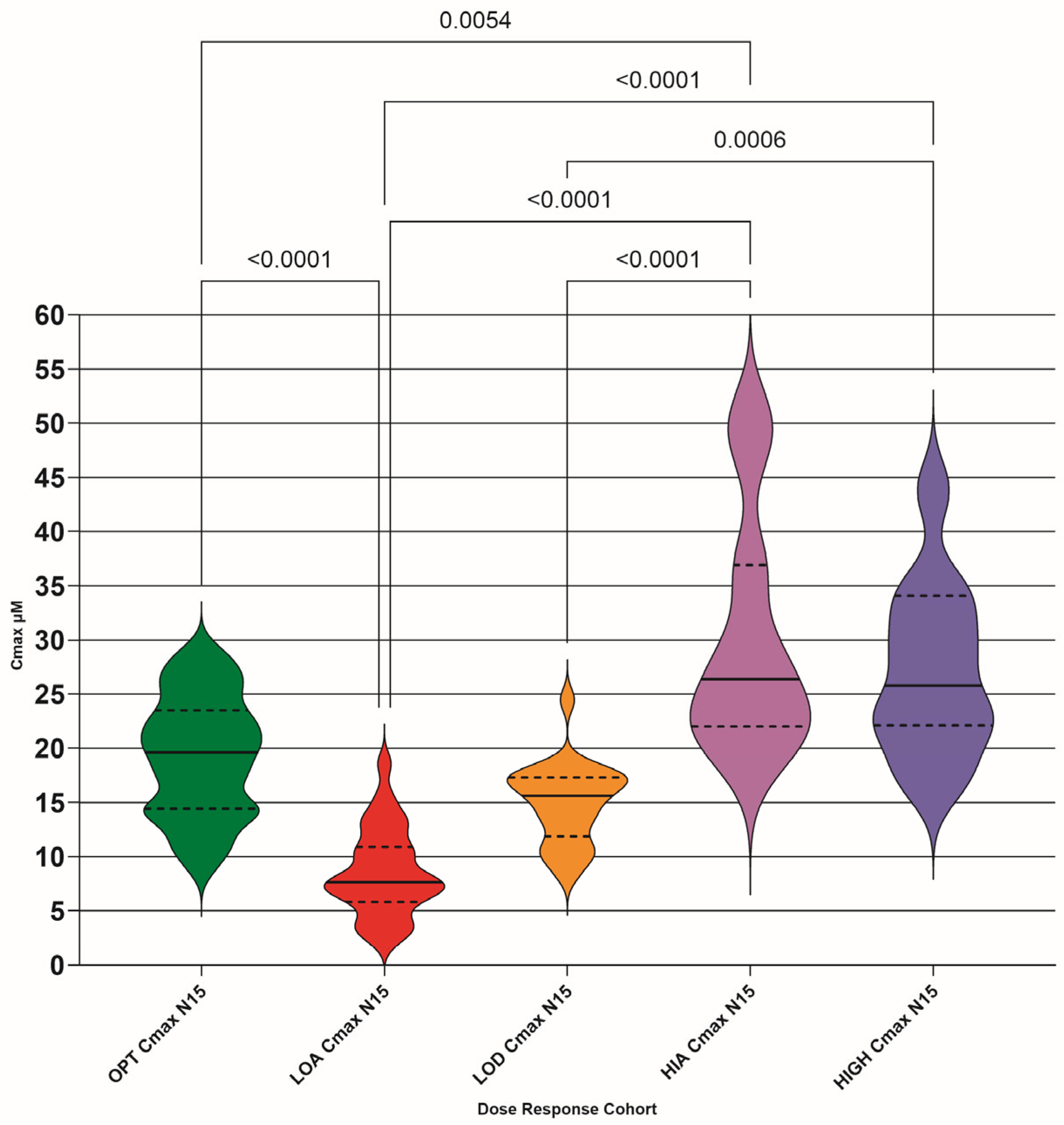 Our study Cmax values show a significant difference between the OPT and LOA, and LOD and HIGH cohorts, suggesting that drug absorption varies in efficiency. The OPT and LOD cohort difference disappeared with normalization, as expected, as the LOD cohort is hypothesized to be caused by lower doses than presently (July 2025) recommended. The OPT and HIA difference appeared with normalization, as expected, as the HIA cohort is hypothesized as being more efficient at drug absorption, so normalizing the dose would increase the amount of drug in the plasma.