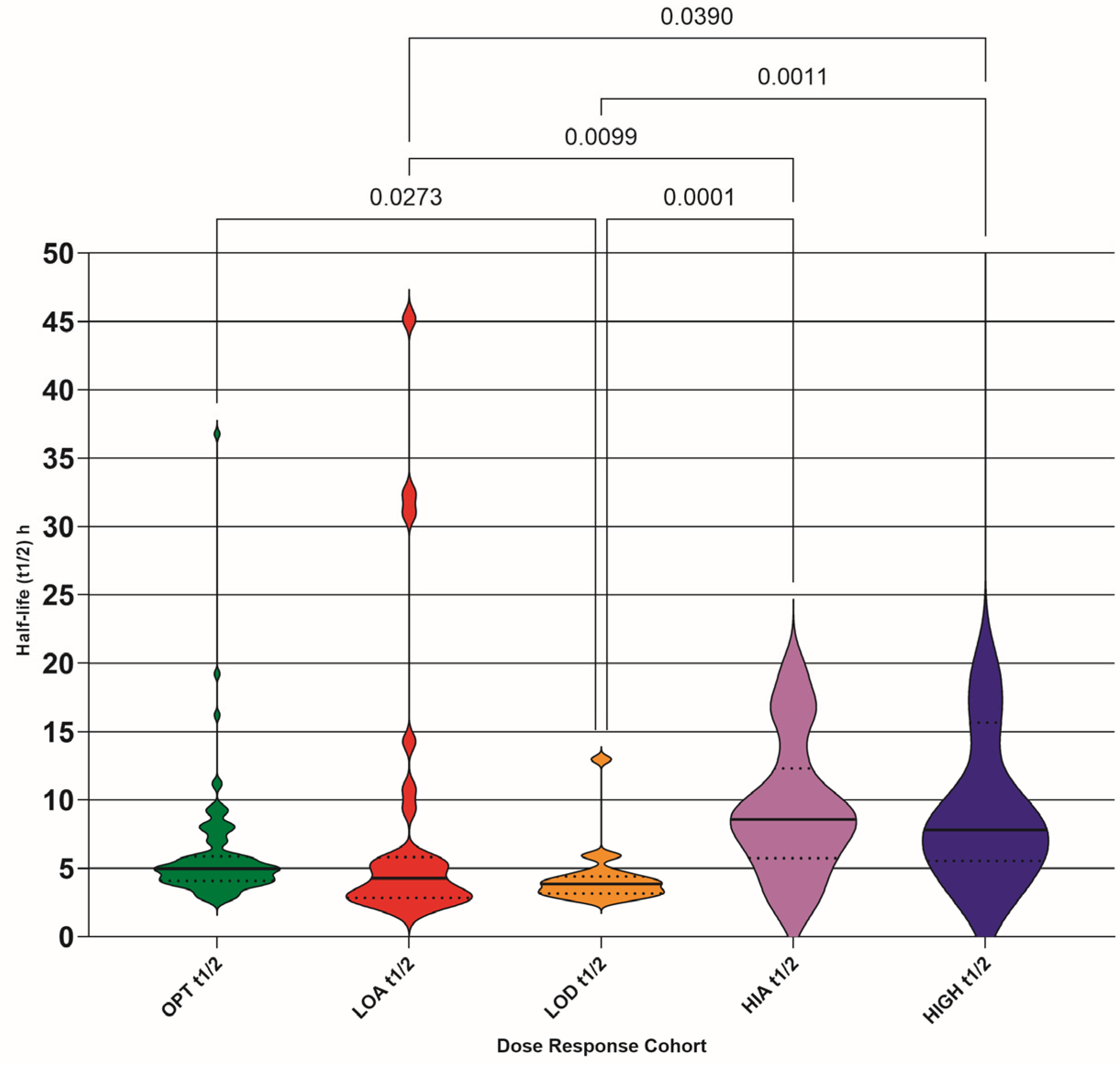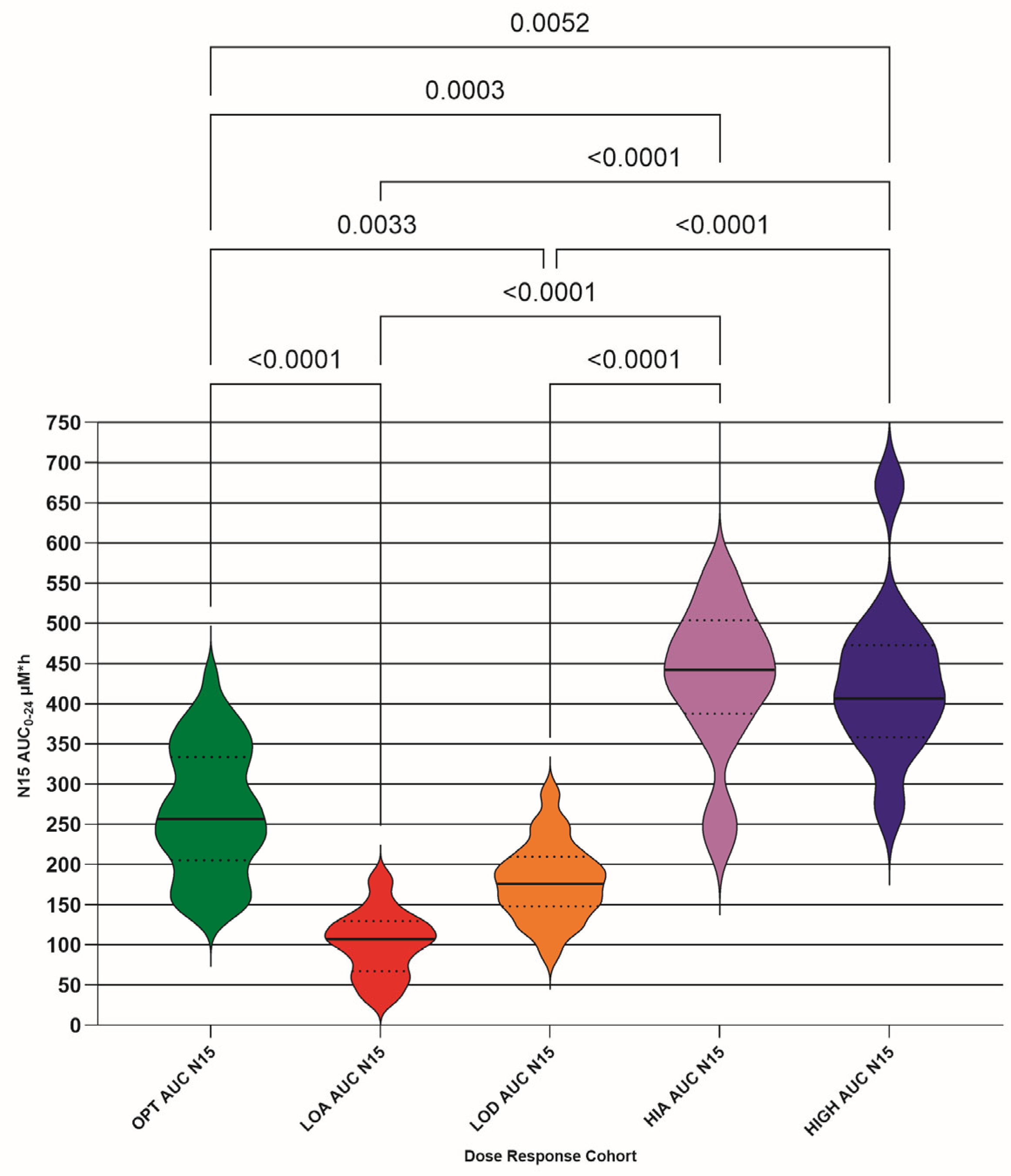 For each PK index (Cmax, t1/2, Tt, AUC0–24, t > 3 µM, and t > 10 µM), the five DRC cohorts were analyzed using GraphPad’s embedded statistical procedures (ordinary one-way ANOVAR with Tukey’s multiple comparison test).