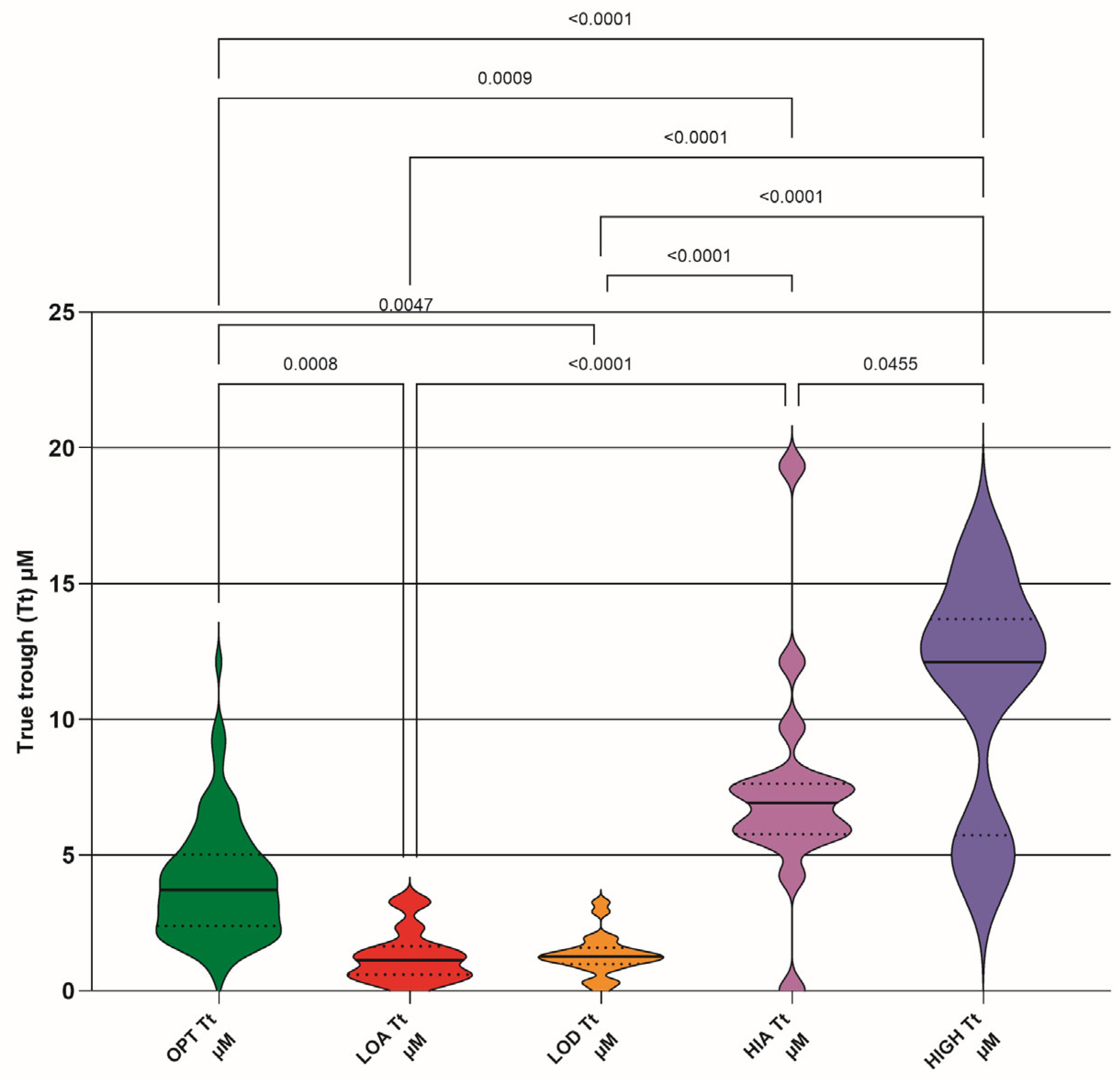 The raw AUC0–24 values also show significant differences between OPT and LOA, and LOD and HIGH DRCs. The OPT and HIA cohort difference appeared when the dose was normalized, again as expected. It was not expected that the OPT and LOD difference would remain when the dose was normalized, so it may be that some of the LOD cohort should have been classified as LOA. We deem this not to be an issue for the outcome of the study, as low plasma GS-44 concentrations would be revealed by TDM where they might otherwise not have been.
