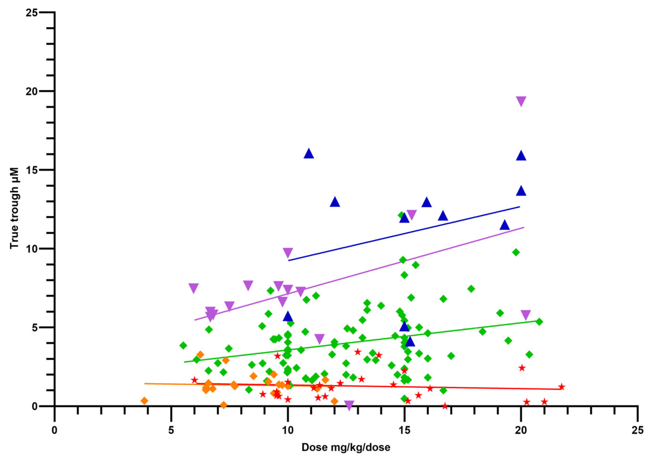 The PK indices of Cmax, half-life (t1/2), and true trough (the concentration at the time of the next dose [Tt]) were calculated using the dose per dose (mg/kg/dose).