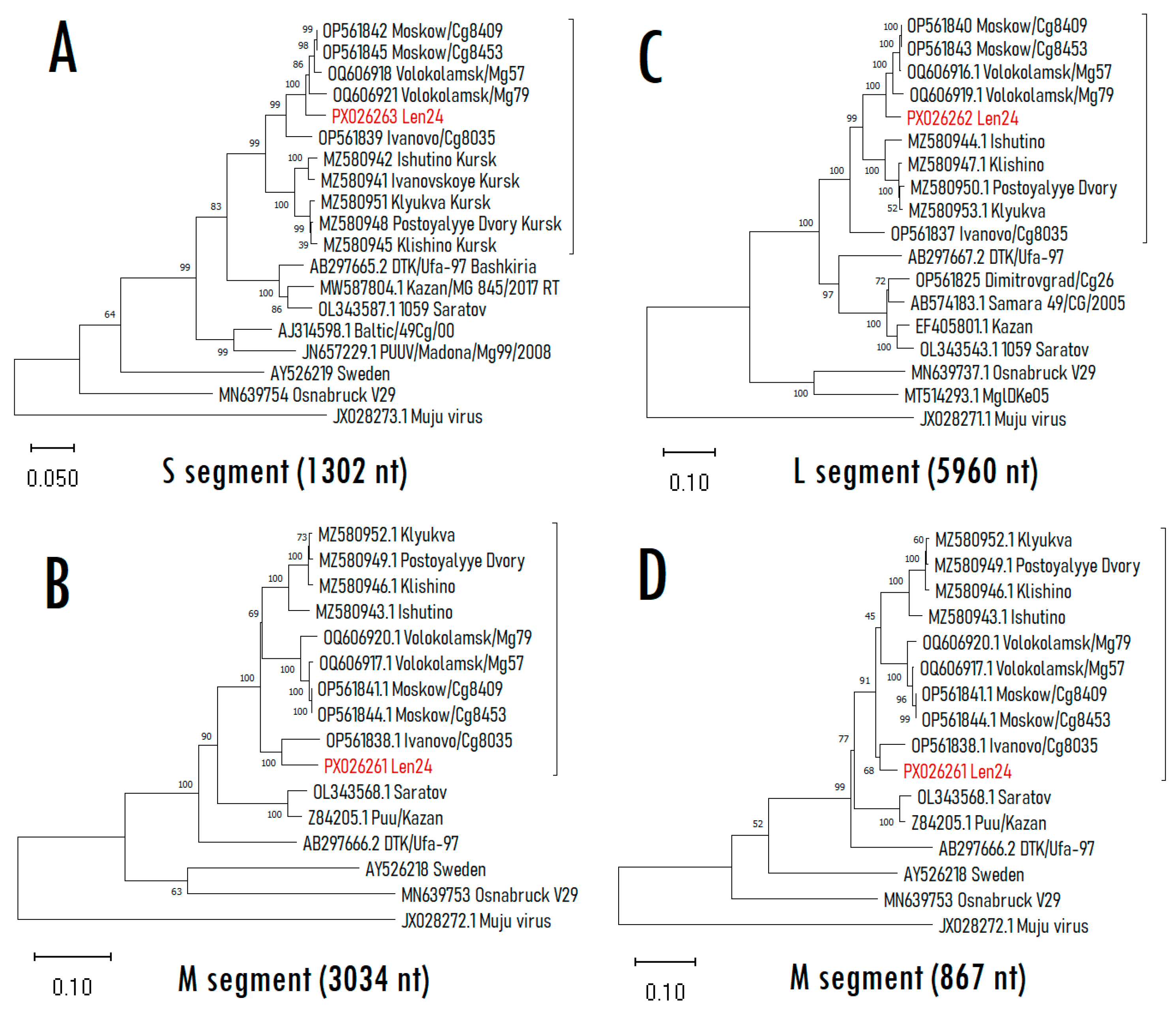 - Blinova, E.; Deviatkin, A.; Makenov, M.; Popova, Y.; Dzagurova, T. Evolutionary Formation and Distribution of Puumala Virus Genome Variants, Russia. Emerg. Infect. Dis. 2023, 29, 1420. [Google Scholar] [CrossRef] [PubMed]