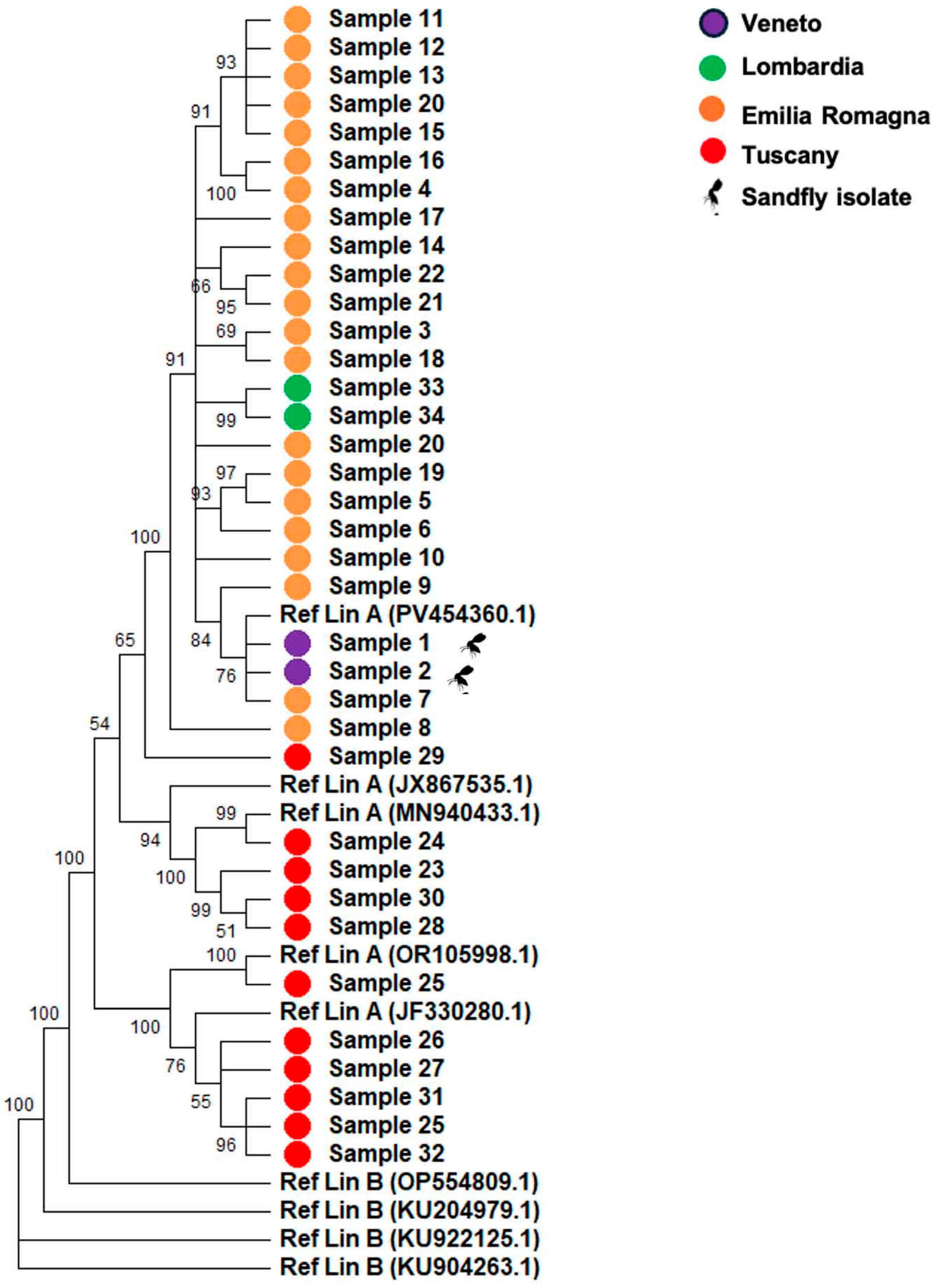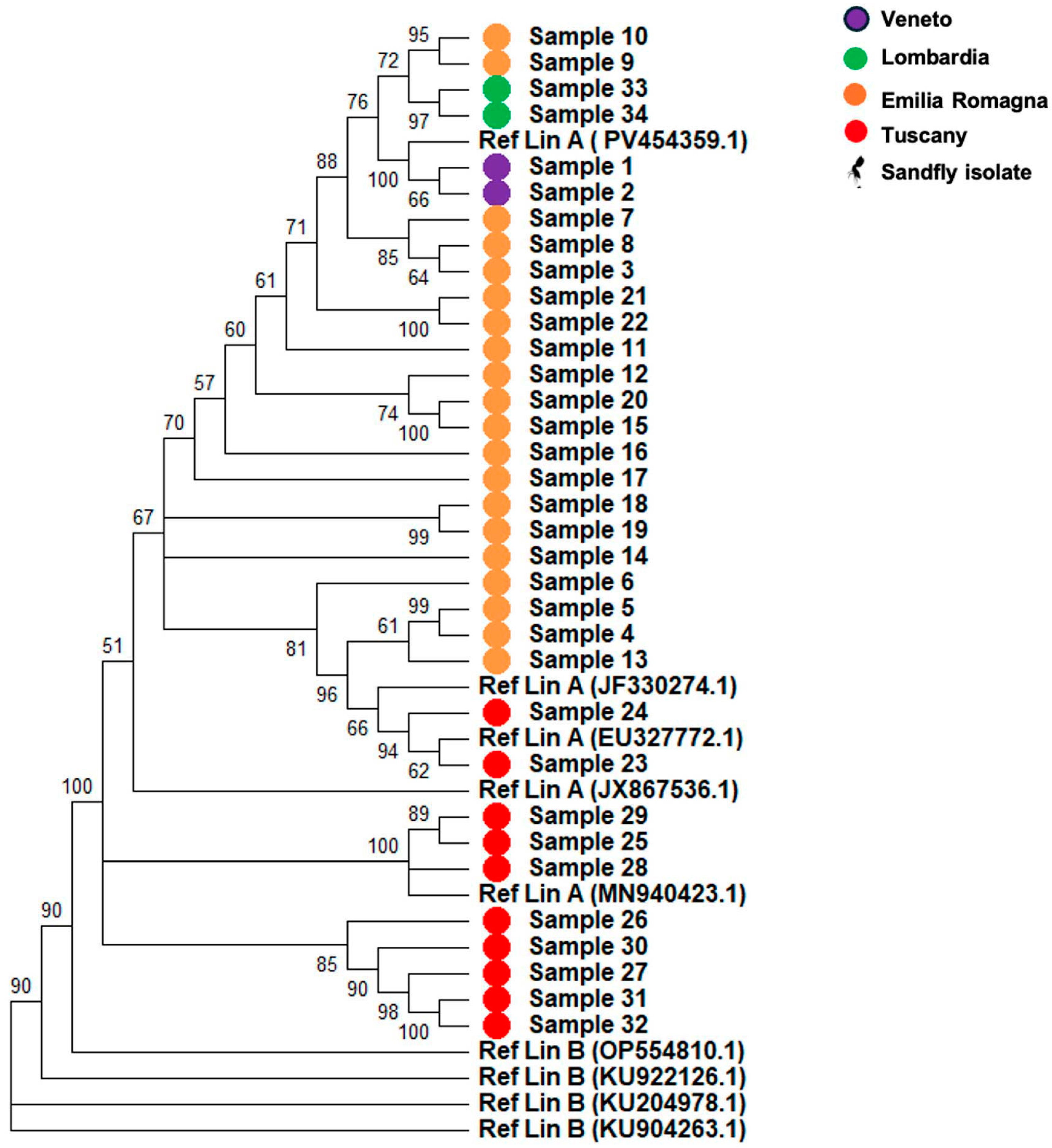 Viral isolates were obtained from different regions of northern and central Italy, including Tuscany (Virology Laboratory, S. Maria delle Scotte Hospital, Siena, Italy), Lombardia (Virology Laboratory, Luigi Sacco Hospital, Milan, Italy), and Emilia-Romagna (Great Romagna Hub Laboratory, Pievesestina, Forlì-Cesena, Italy). Specifically, twenty isolates were from the Bologna area (samples 3–22), ten from the Siena area (samples 23–32), and two from Milan (Lombardia) (samples 33–34). Additional viral isolates were obtained from homogenates of sandflies provided by the Istituto Zooprofilattico Sperimentale delle Venezie (IZSVe, Veneto, Italy) (samples 1,2).