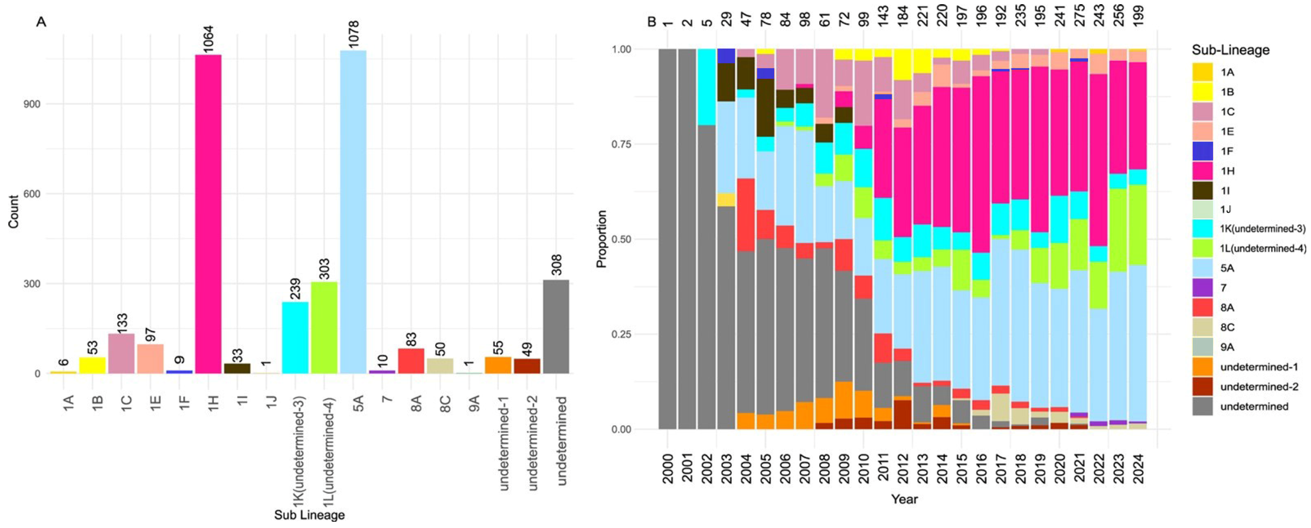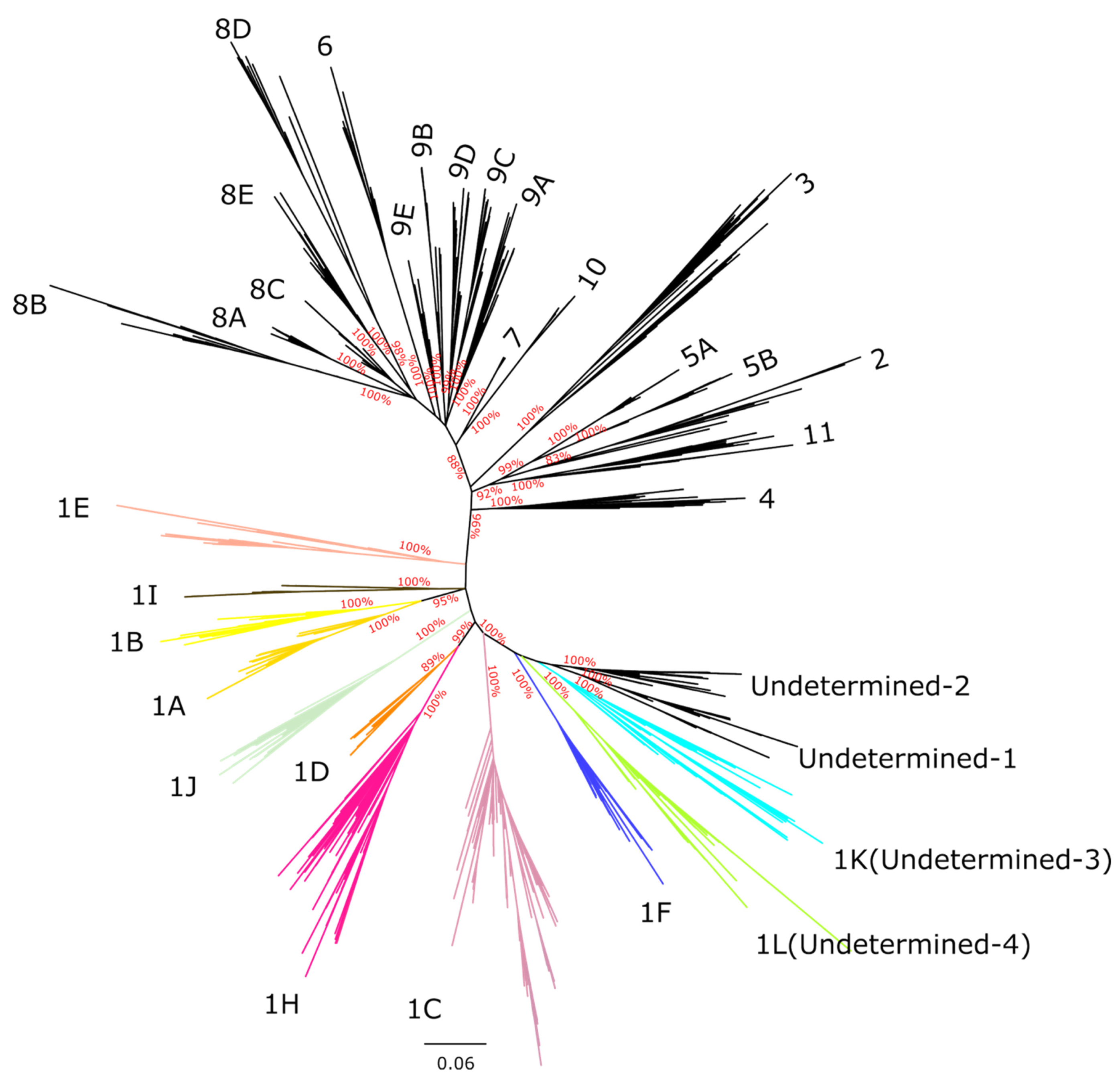 3.4. Evidence of Intra-Sub-Lineage Recombination Was Detected in a Small Number of 1K and 1L Sequences