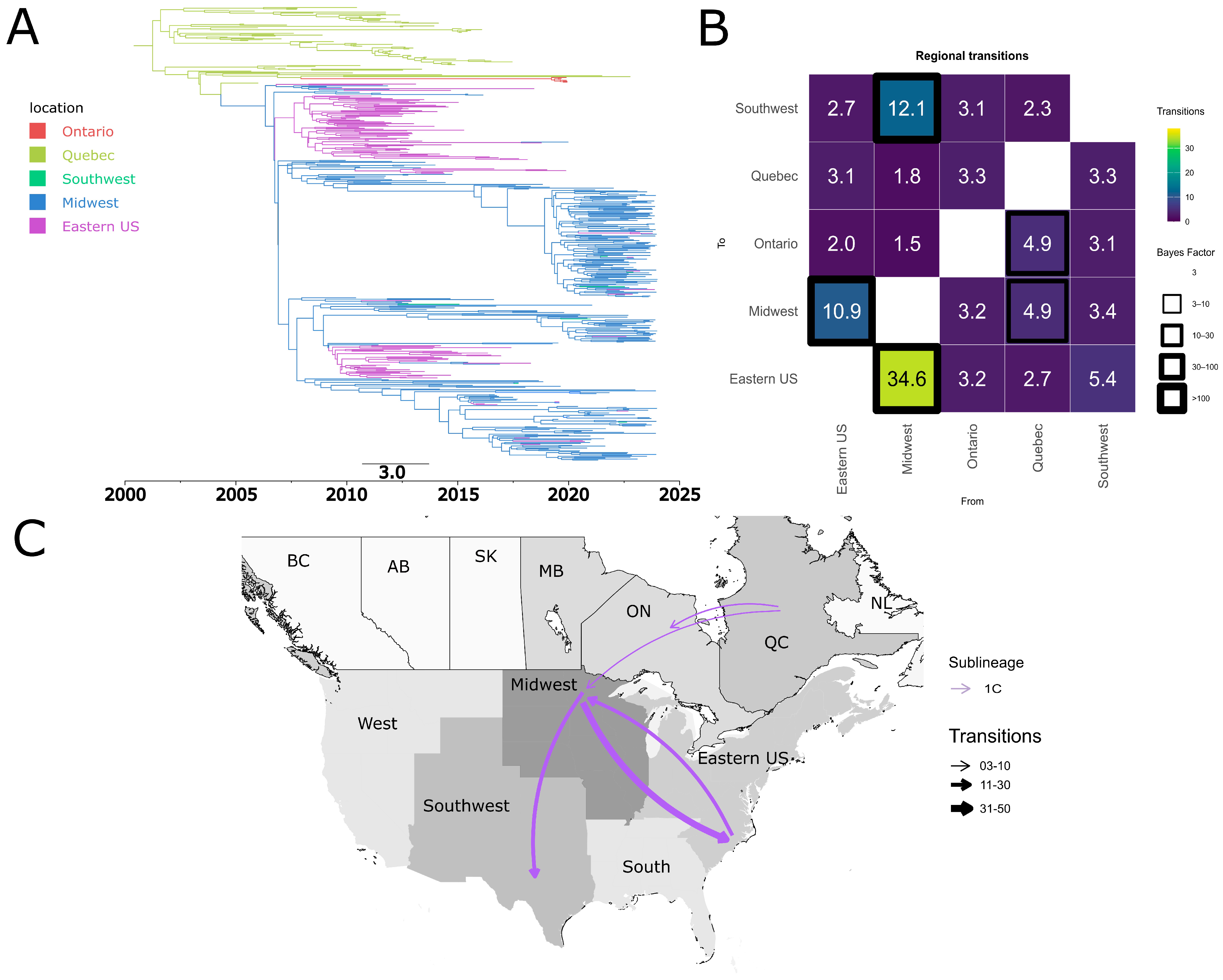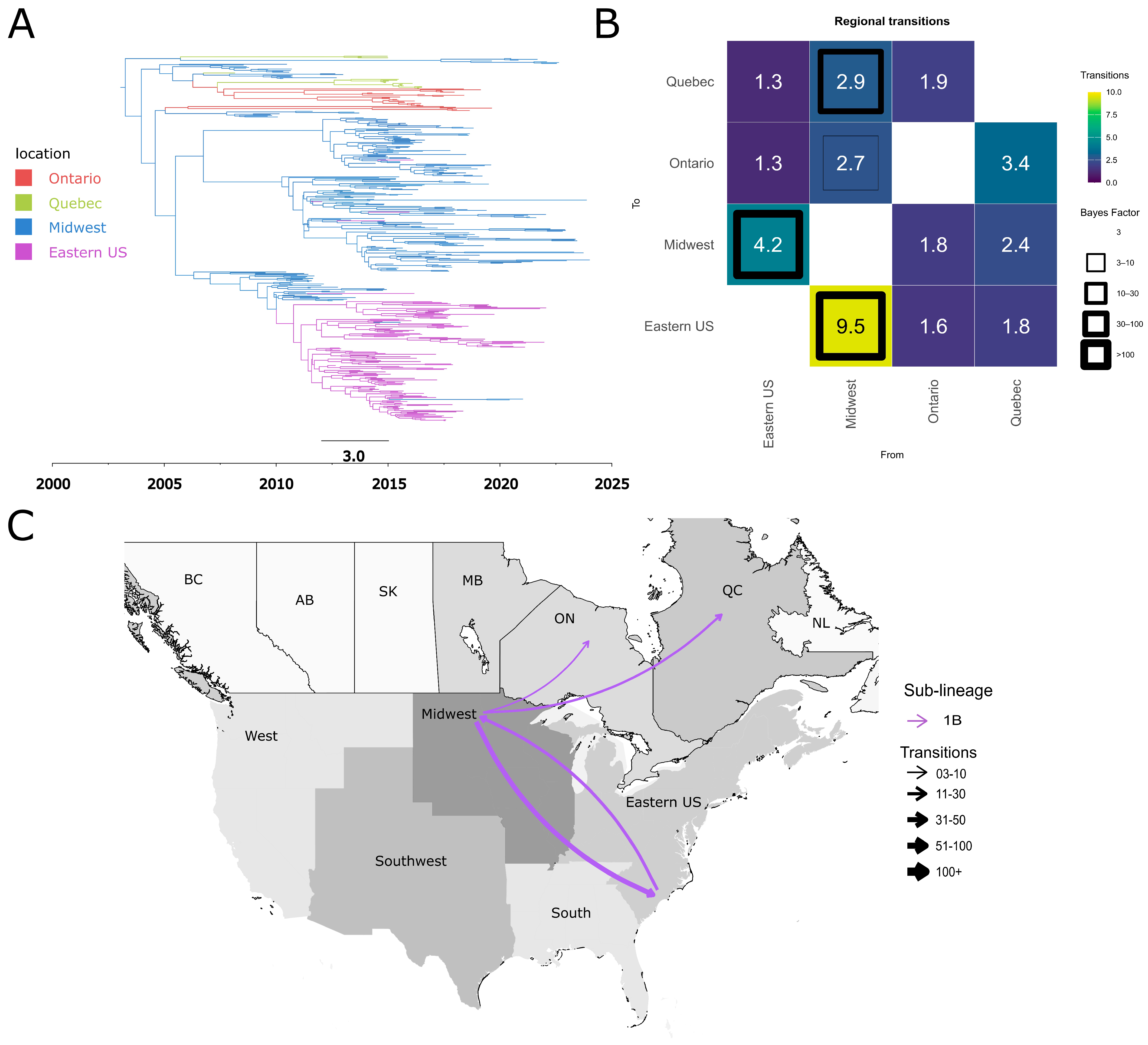 3.6. Quebec and the USA Midwest Are Potential Hubs for the Dispersal of PRRSV-2 Sub-Lineages Between Canada and the United States