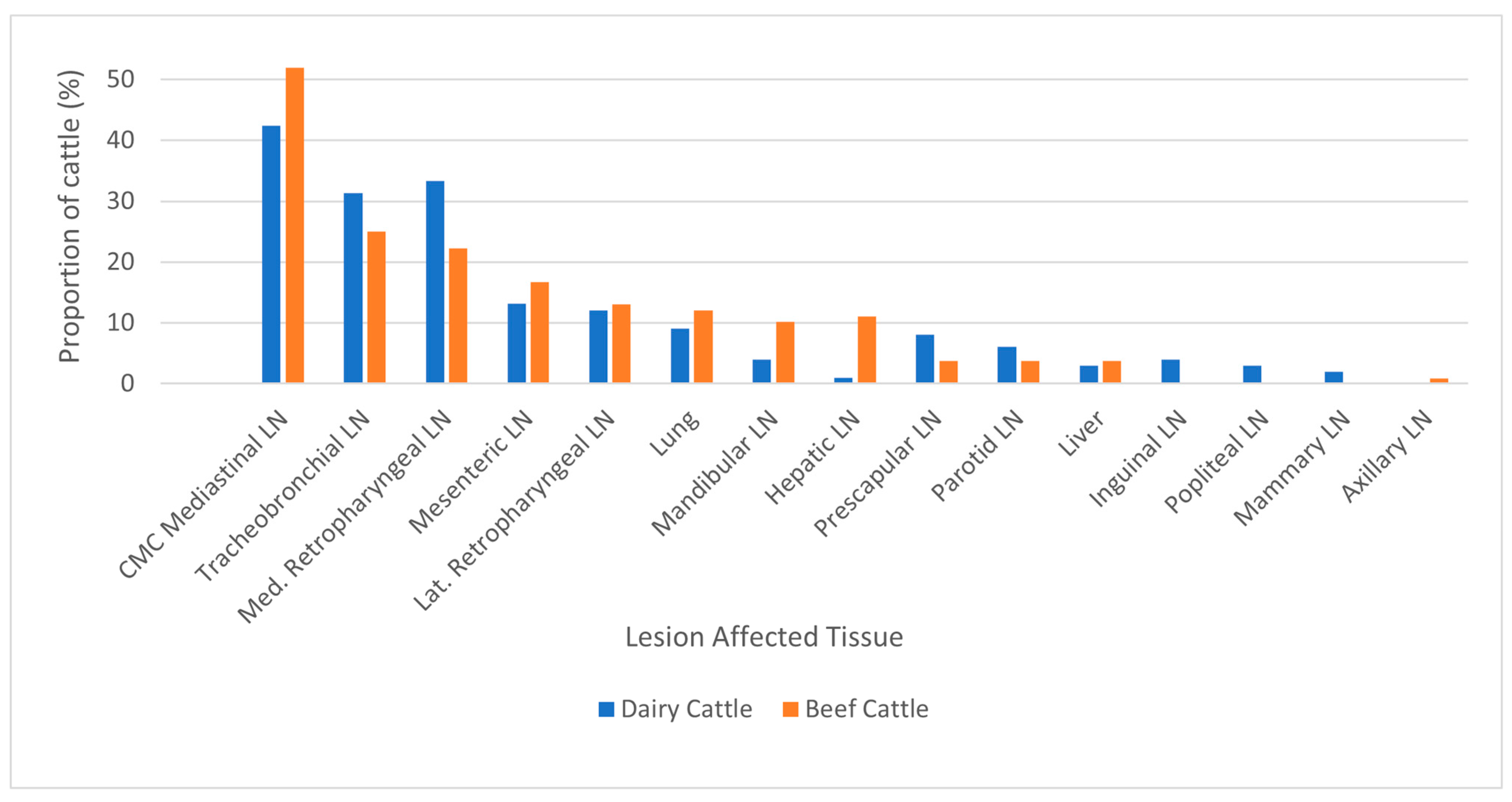 Figure 4). Beef and dairy cattle showed similar patterns in lesion distribution. Notably, beef cattle were significantly more likely to have lesions in the hepatic lymph node (11.1% and 1.0%, respectively).