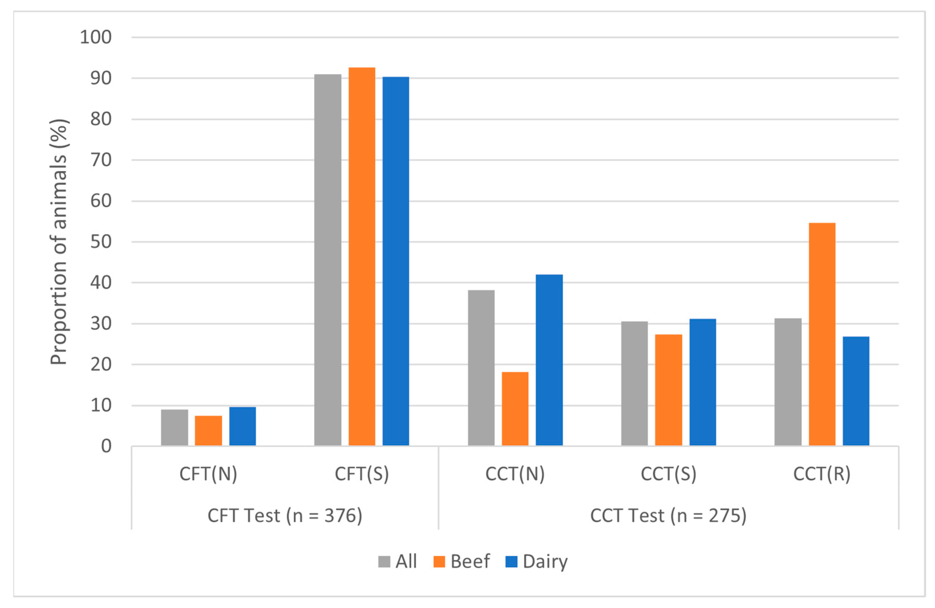 p = 0.003) between beef and dairy cattle, with the CCT positivity rate, defined as those classified as either suspect or reactors, being 81.8% in beef compared to only 58.0% in dairy cattle. Test performance stratified by herd was variable. Although CFT performance was relatively consistent among herds and similar if not greater than established sensitivity levels [