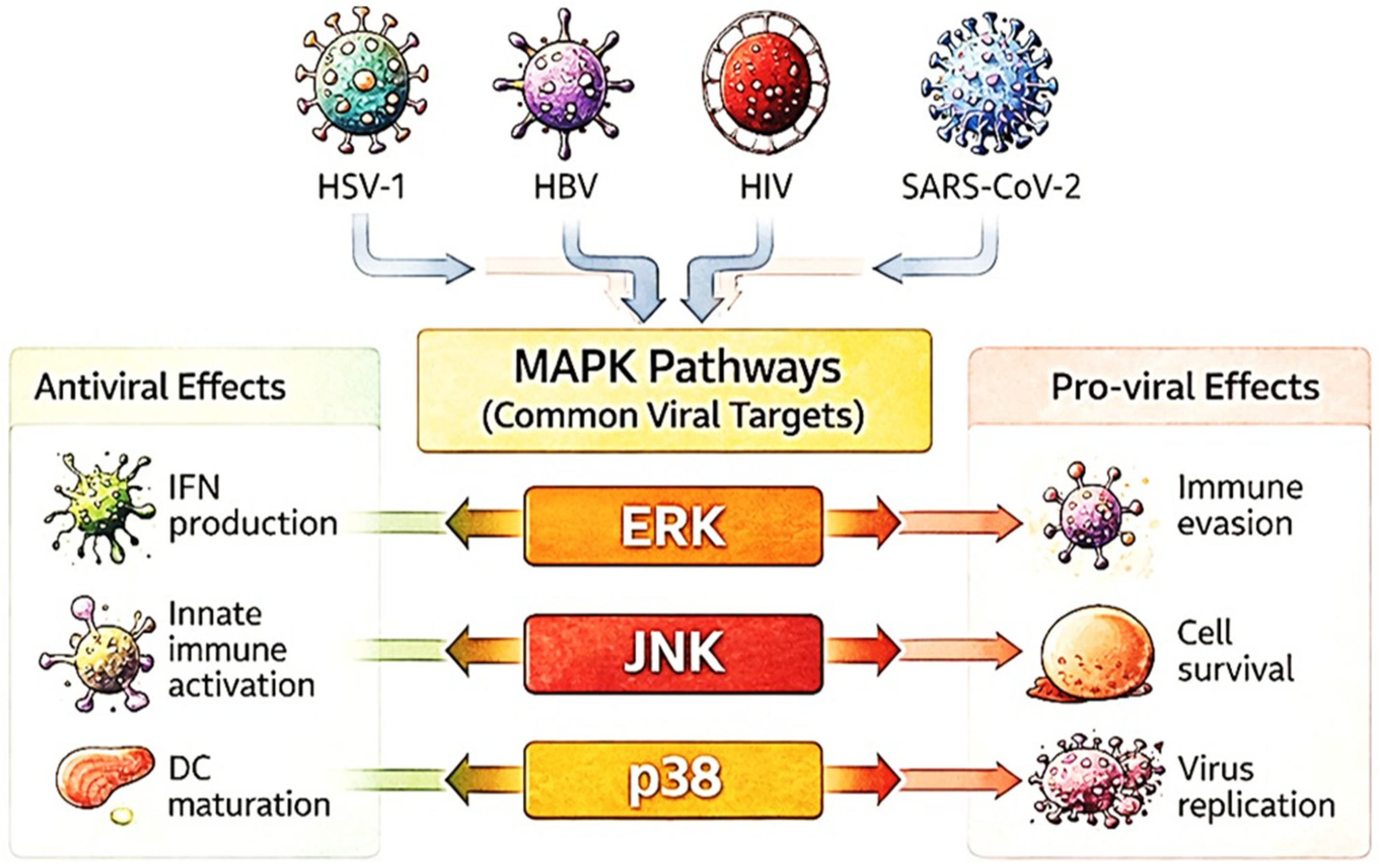 Importantly, viral manipulation of MAPK signaling occurs within a highly interconnected network, where ERK, JNK, and p38 exhibit compensatory and cooperative dynamics; thus, modulation of one pathway often reshapes the activity of others, collectively determining infection outcomes. Within this networked framework, viruses exploit MAPK pathways not as simple binary switches but as complex, context-dependent signaling hubs. Viruses such as HSV-1, HBV, HIV, and SARS-CoV-2 commonly target ERK, JNK, and p38 pathways to modulate host immune responses. Depending on the viral strategy, stage of infection, and host cell type, MAPK activation can drive either antiviral outcomes, such as interferon production and dendritic cell maturation, or pro-viral effects, including immune evasion, enhanced replication, and cell survival (