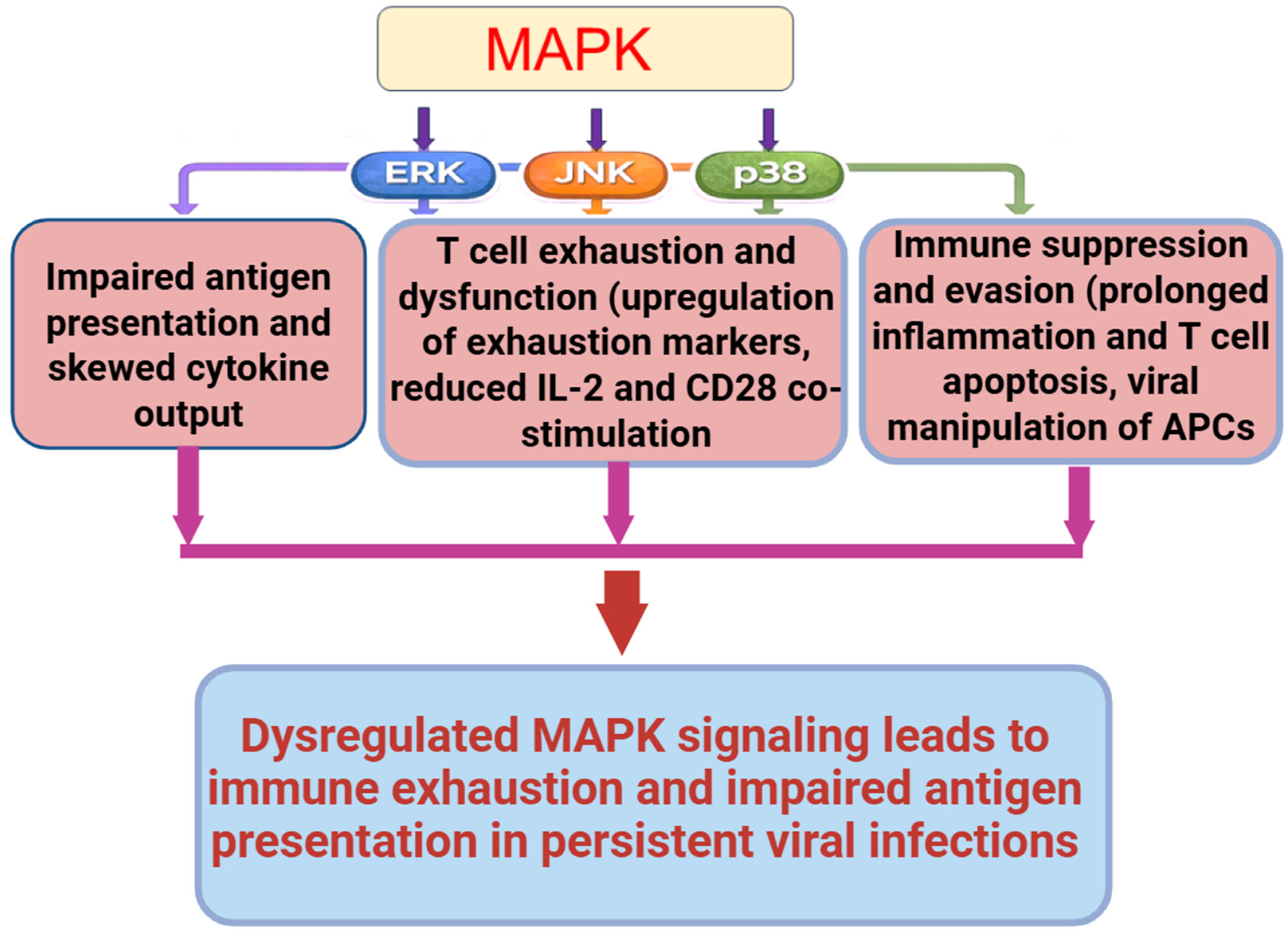 16]. This response aids initial defense but can be overzealous. In later stages, sustained or unresolved MAPK activity contributes to immune suppression. For instance, chronic ERK activation in HIV enhances early viral replication but later drives T cell exhaustion and weakens memory formation [