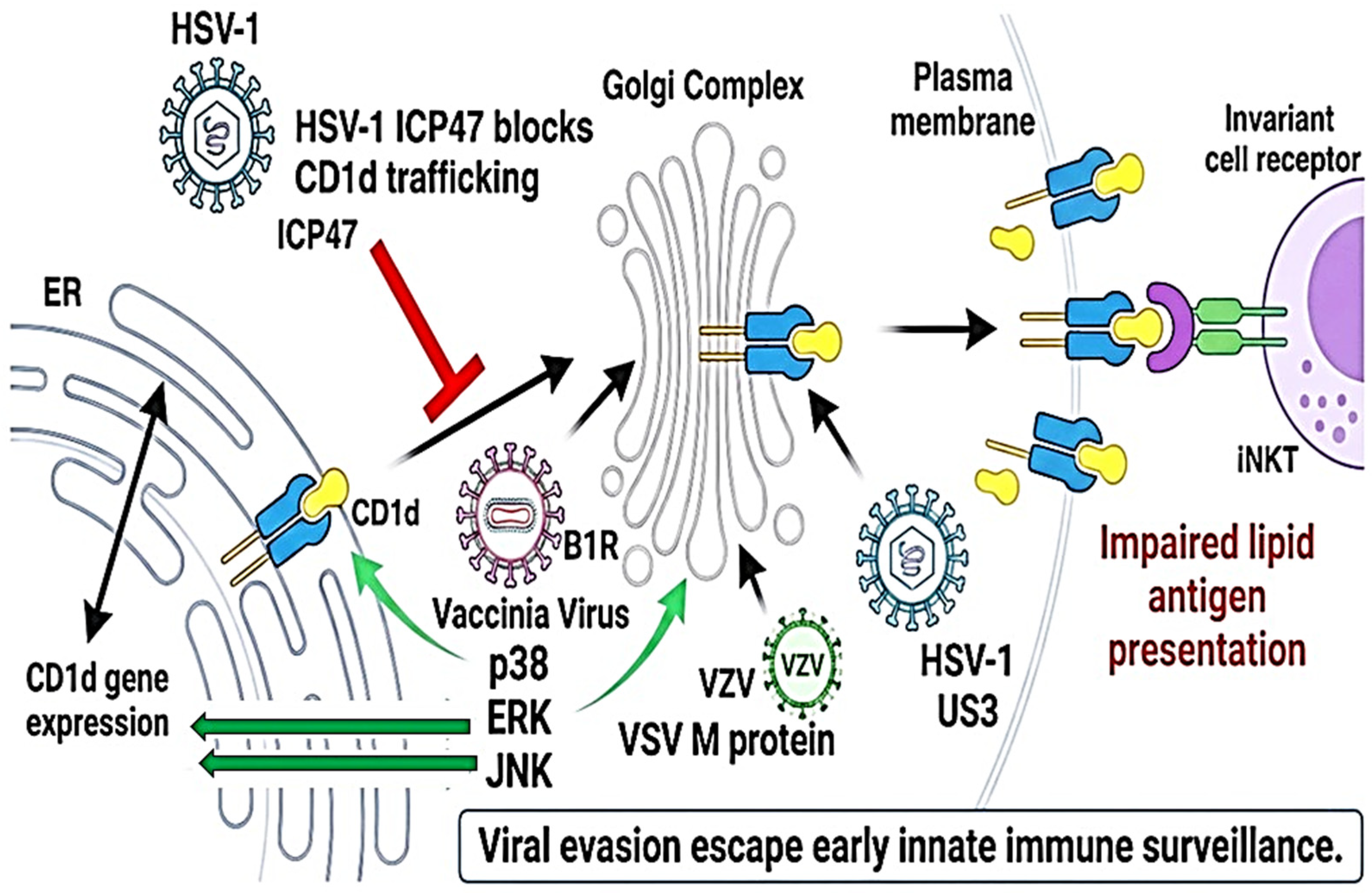 23]. Multiple viruses, including vaccinia virus, HSV-1, and vesicular stomatitis virus (VSV), interfere with CD1d expression or trafficking to evade iNKT-mediated surveillance, often by hijacking MAPK signaling components [