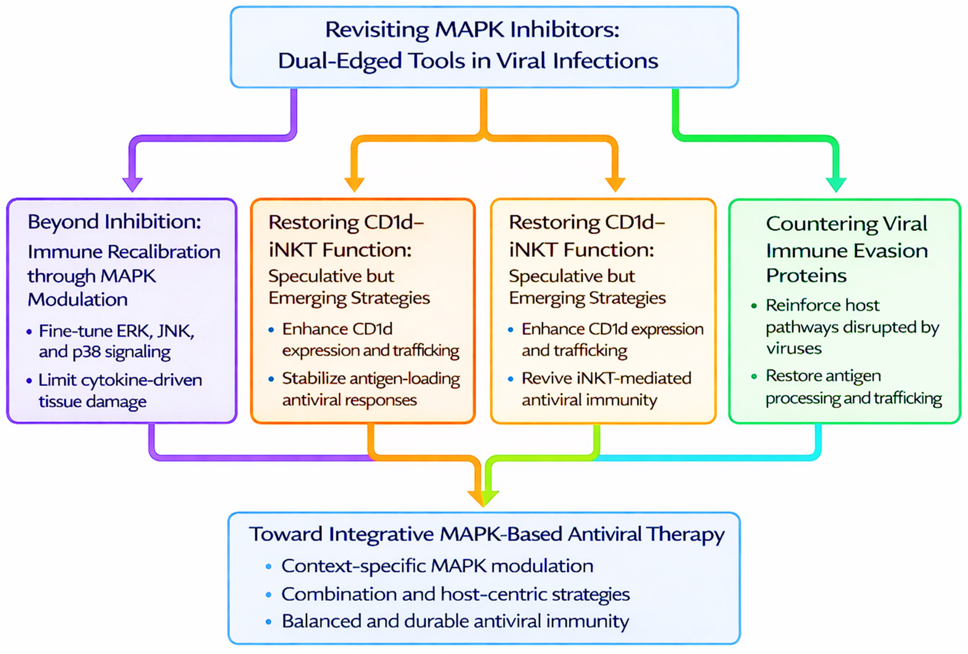 Despite these advances, the clinical translation of MAPK-targeted and CD1d-based interventions remains limited and faces several practical constraints. A key challenge lies in the limited availability of robust clinical data, as most current evidence is derived from preclinical models or repurposing studies, restricting conclusions about efficacy and safety in human viral infections. In addition, therapeutic strategies targeting the CD1d–iNKT axis are hindered by delivery and implementation barriers, including inefficient in vivo targeting, instability of lipid antigens, and variability in iNKT cell responsiveness across individuals. Furthermore, the integration of MAPK modulation with immune-based therapies is complicated by heterogeneous patient responses and disease-specific variability, which are not yet adequately captured in existing models. These limitations highlight the need for improved translational frameworks, including clinically relevant infection models, biomarker-guided patient stratification, and optimized delivery systems, to bridge the gap between mechanistic insight and therapeutic application.