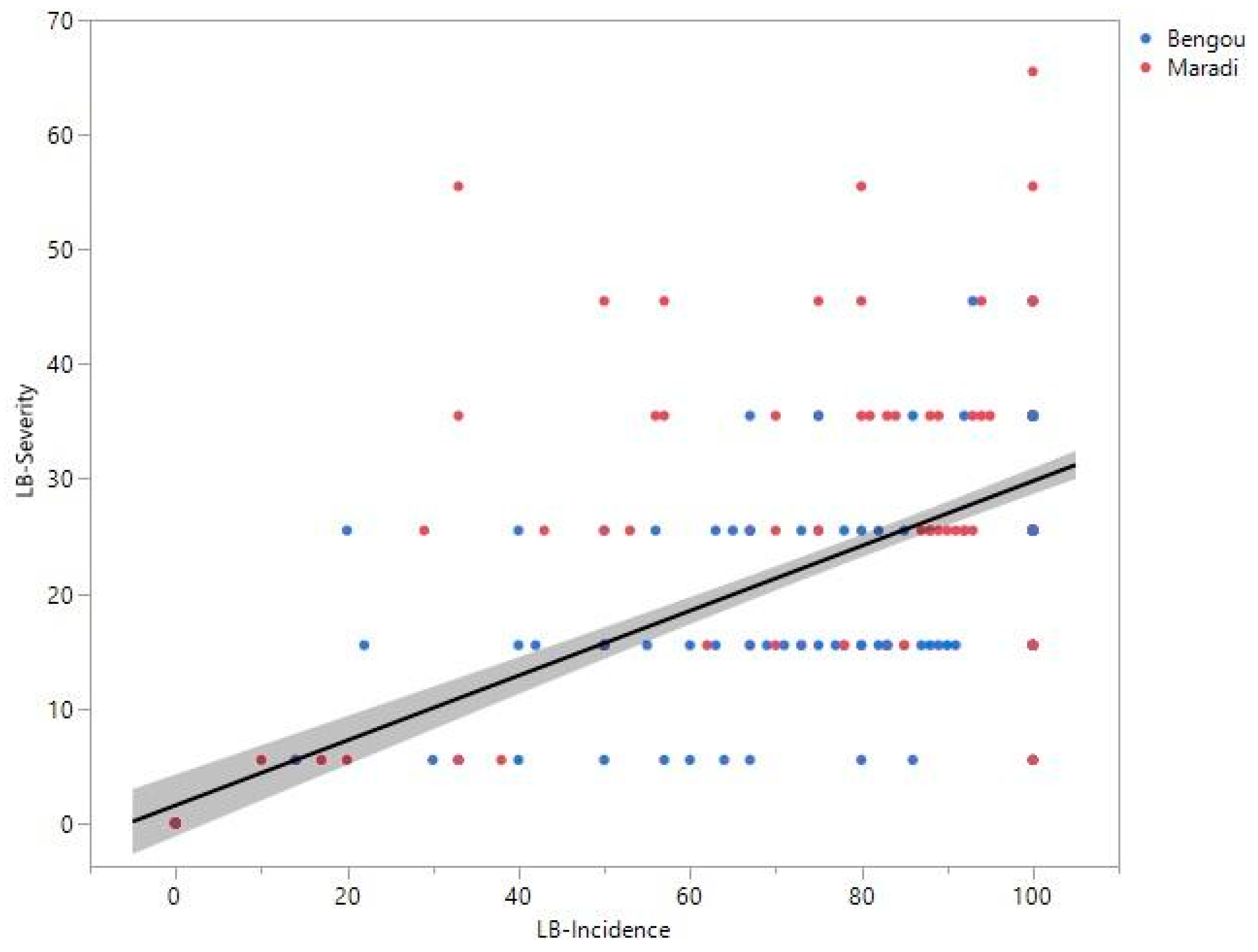 3.1. Leaf Blight Incidence and Severity in Nigerien Sorghum Germplasm