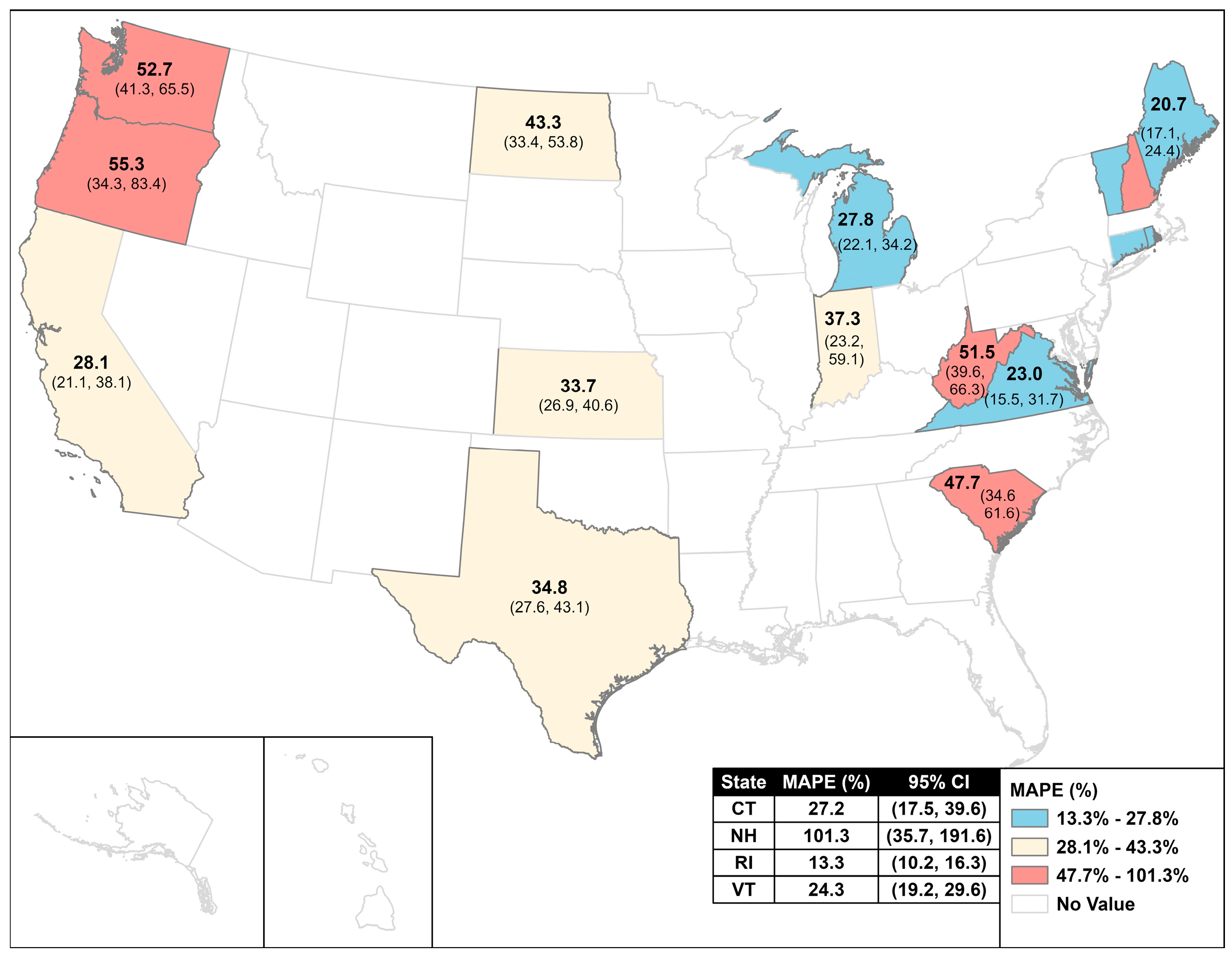 Model performance was assessed by calculating the MAE and the Mean Absolute Percentage Error (MAPE) for each model configuration. MAE reflects the average deviation between predicted and observed Lyme disease case counts. MAPE reflects the mean of the absolute differences between predicted and observed incidence, divided by the observed incidence, expressed as a percentage. To quantify uncertainty, we generated bootstrapped estimates of MAE and corresponding 95% confidence intervals (CIs) using 1000 resamples. Comparisons between models were made by examining the degree of overlap in the CIs for MAEs: non-overlapping CIs were interpreted as indicating a statistically significant difference in predictive performance, while overlapping CIs suggested no significant difference between models. The canine and One Health models for the three states are not included due to missing canine search term data, as described above.