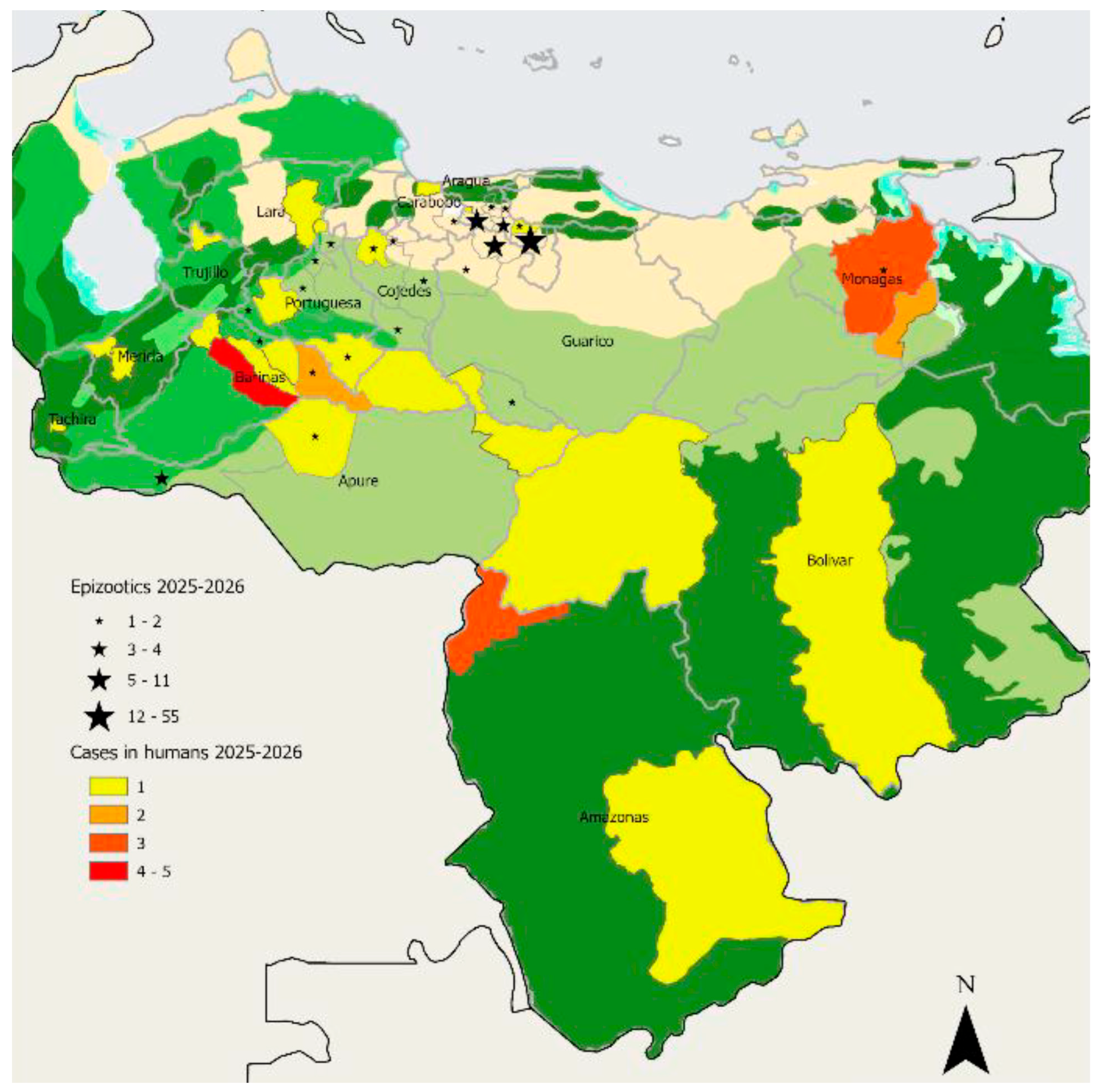 - Rodriguez-Morales, A.J.; Navarro, J.-C.; Forero-Peña, D.A.; Romero-Alvarez, D. Reemergence of yellow fever in Venezuela, 2025/2026. New Microbes New Infect. 2026, 70, 101737. [Google Scholar] [CrossRef]