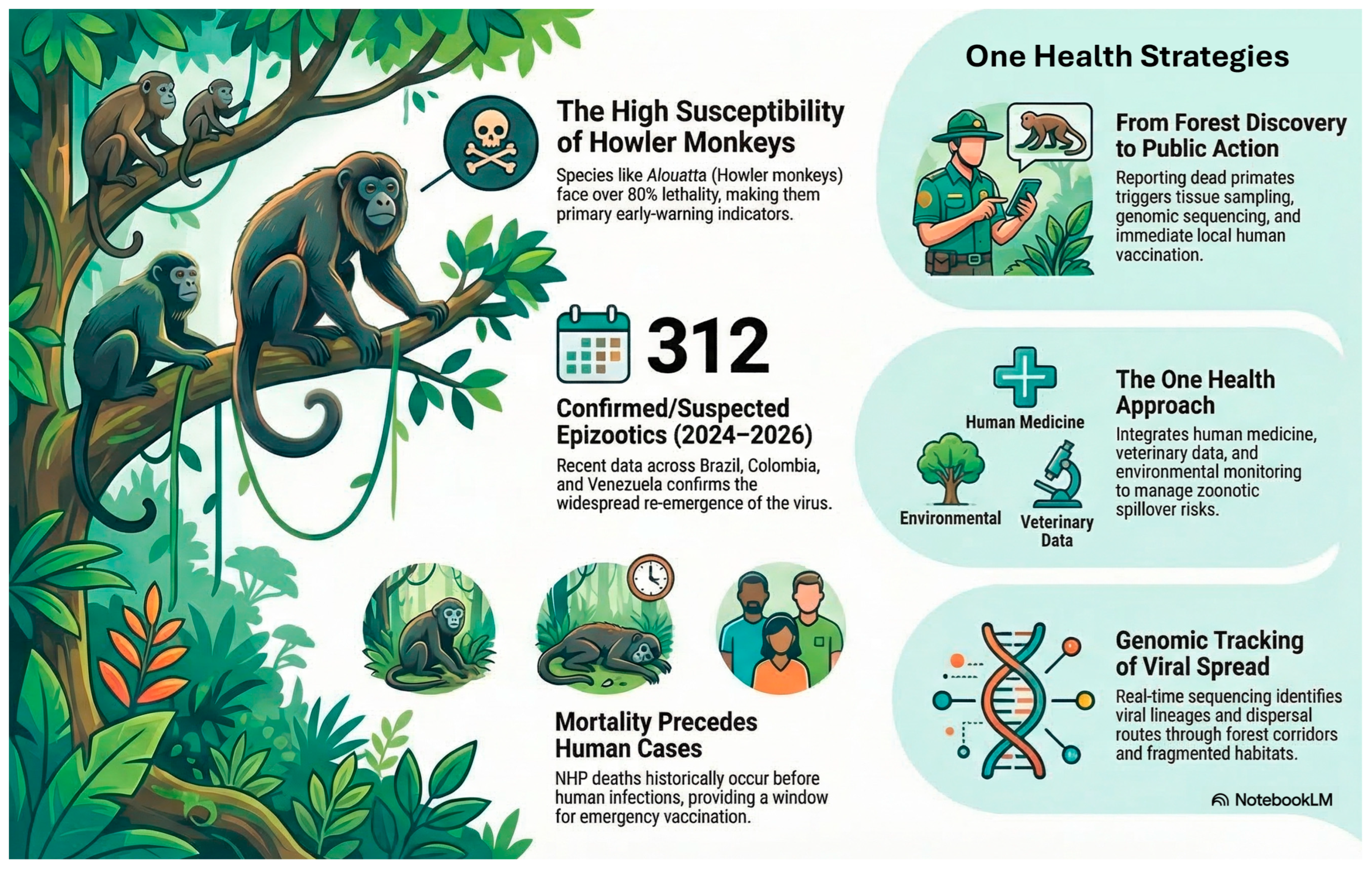 | Alouatta | Howler Monkey | Central America and much of South America | Very high | Very high (often >80%) | Key Sentinel and Amplifying Host |