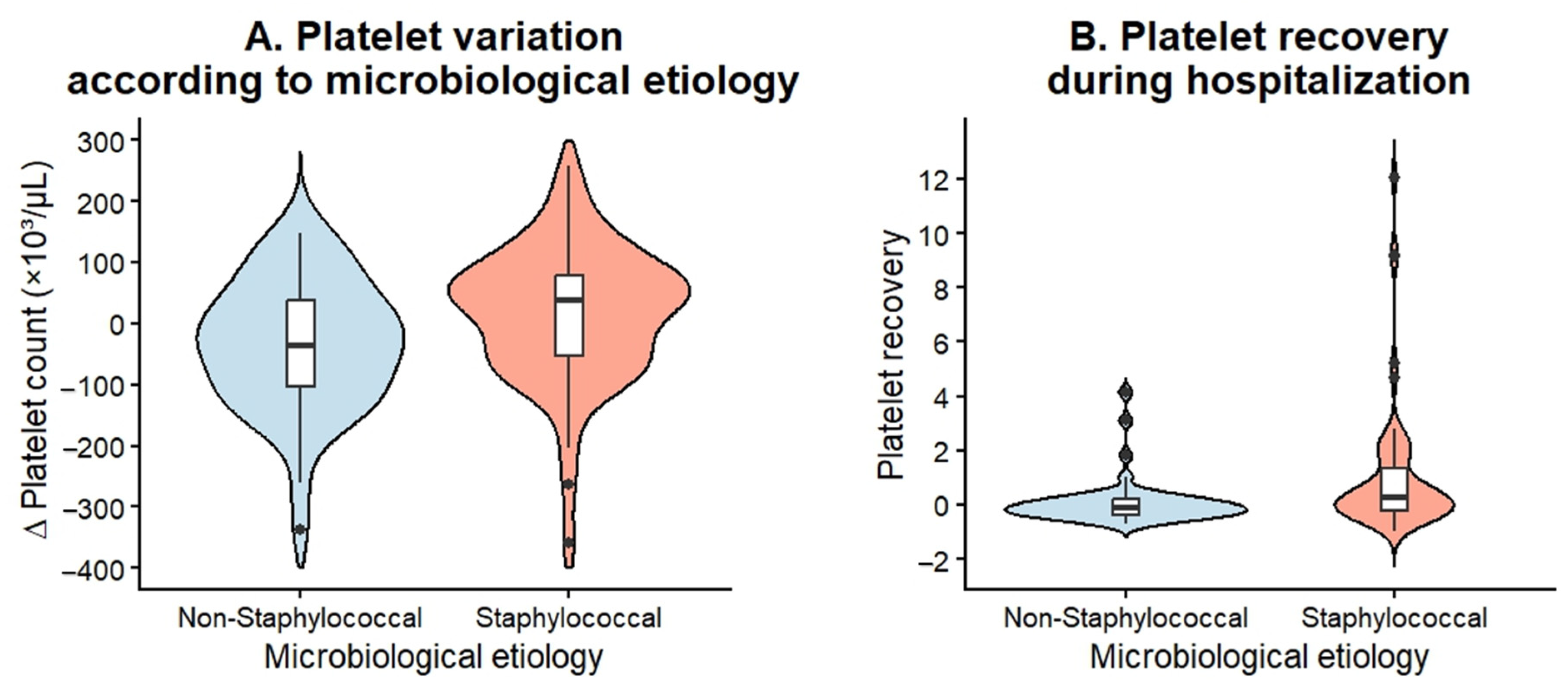 | Δ Platelet count (cells/µL), median (IQR) | −35,000 (141,000) | 43,000 (143,250) | 1037.5 | 0.007 |