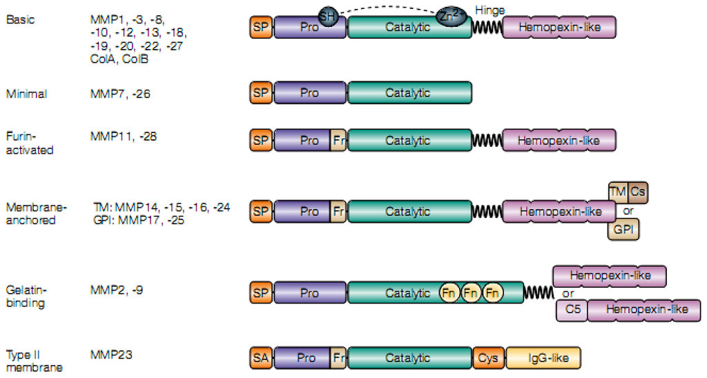 All members of this family share a basic structure consisting of some common functional domains i.e., a signal peptide, a pro-peptide and a catalytic domain, containing a Zn2+ binding site (Figure 1).