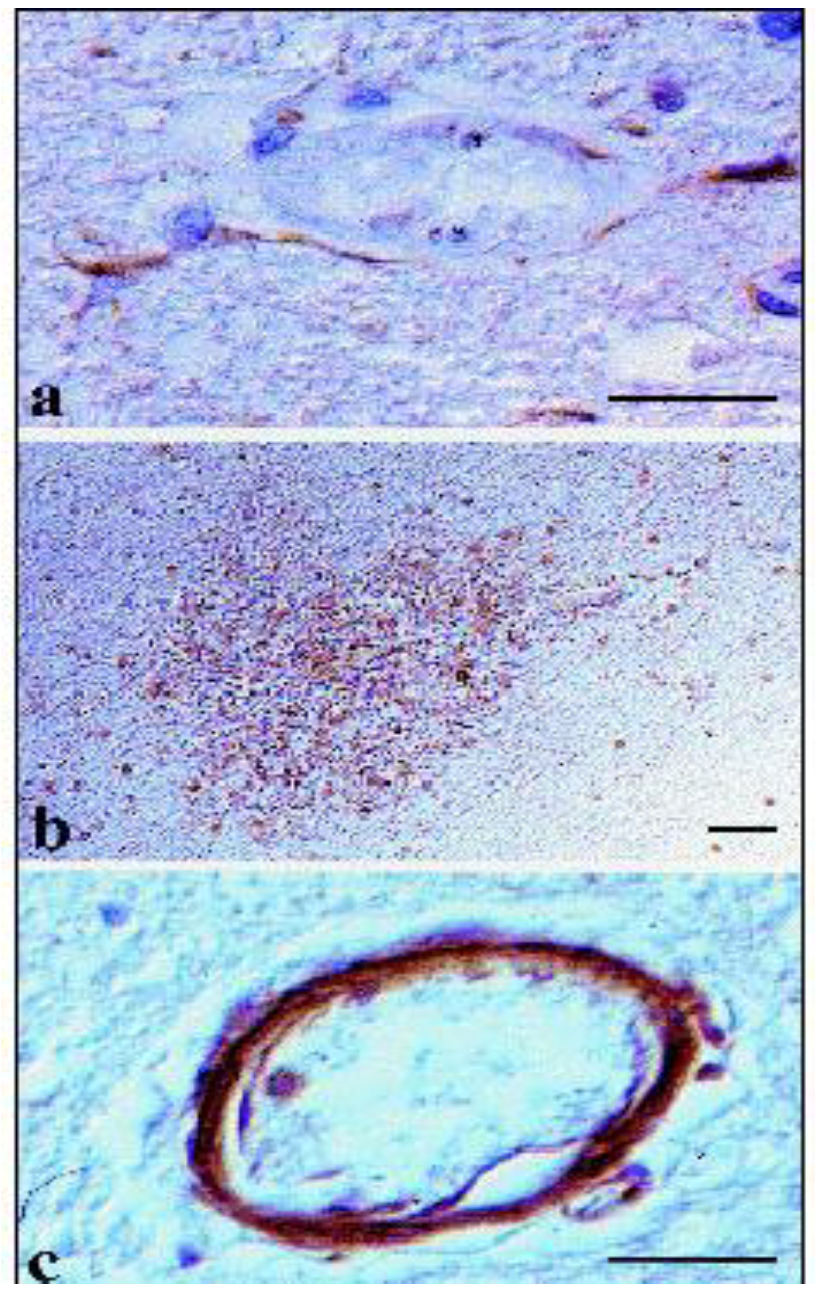 Some aspects of pathogenesis of cerebral malaria. In brains of patients who died with cerebral malaria, TGF-beta1 immunoreactivity (brown color) was found in astrocytes that form the blood-brain barrier around cerebral capillaries, characterized by deposition of malarial pigment and sequestration (a). TGF-beta2 (brown color) immunoreactivity was found in macrophages/microglial cells in Dürck´s granulomas and in glioses of ring hemorrhages (b). TGF-beta3 immunoreactivity (brown color) was found in endothelial and smooth muscle cells in capillaries with deposition of malarial pigment and sequestration (c). All slices were counterstained with hematoxylin eosin. Bars = 25 μm. (From [113], with permission.)
