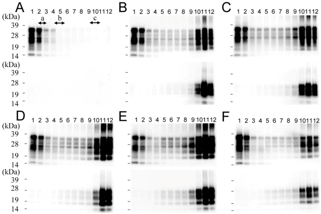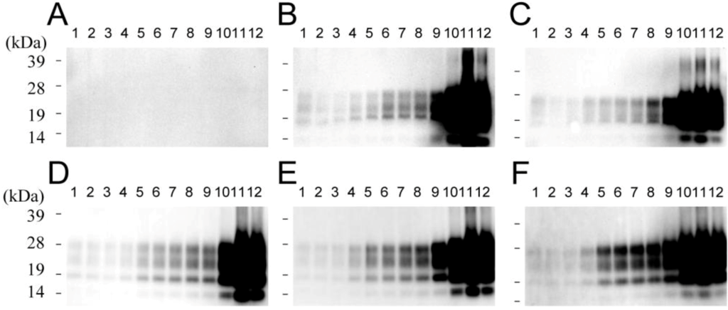 Long-exposure Western blots of PrPSc in control mice (A) and mice affected by the Chandler (B), mBSE (C), 22L (D), ME7 (E) and Tsukuba-2 (F) strains. The same membranes shown in the lower panel of Figure 1 were exposed for a longer time to visualize the faint PrPSc signals. The PrPSc signal was observed in fractions 1–12 for all the prion strains examined. The molecular markers indicated are 39, 28, 19 and 14 kDa.