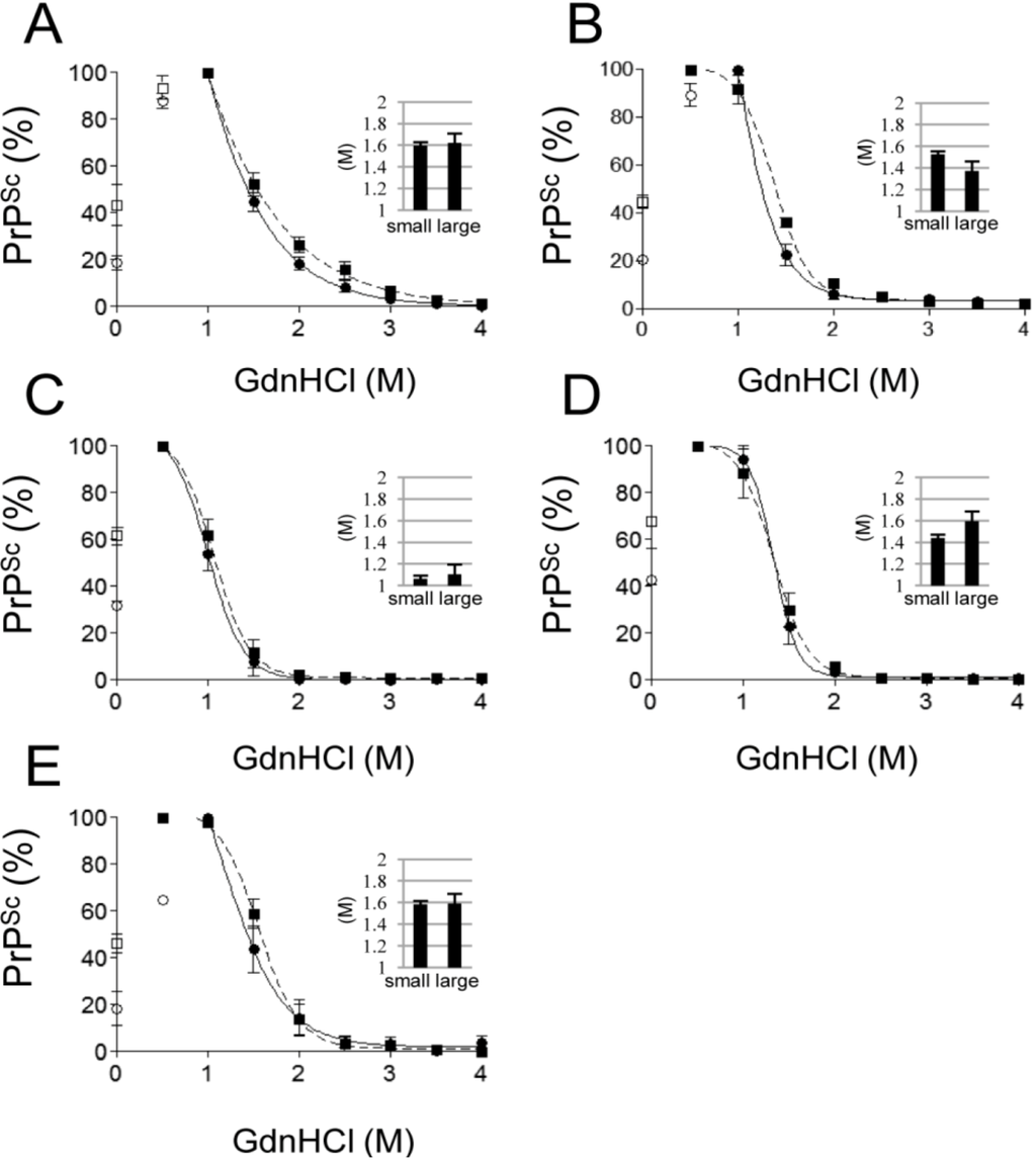 Conformational stability of small and large PrPSc aggregates against GdnHCl. Small (circle and solid line) and large (square and dashed line) PrPSc aggregates were treated with different concentrations of GdnHCl. The signal intensity of PrPSc in Western blots was normalized by using the highest signal intensity observed in each strain (0.5 or 1 M of GdnHCl). Dose-response curves of the Chandler (A), mBSE (B), 22L (C), ME7 (D) and Tsukuba-2 (E) strains are shown. Closed circles and squares were used to obtain the curves. Open circles and squares were omitted from the calculation. The inset graphs indicate the concentration of GdnHCl that denatured 50% of PrPSc ([GdnHCl]1/2). Data represent the mean ± SEM of four independent experiments.
