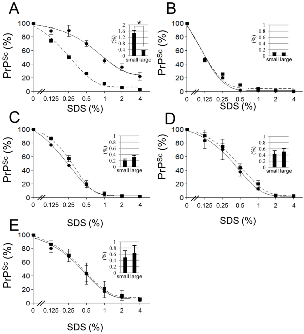 The aggregation stability of small and large PrPSc aggregates was assessed by SDS denaturation. The dose response was strikingly different between small and large PrPSc aggregate fractions in the Chandler strain (Figure 3A). Small PrPSc aggregates had significantly higher [SDS]1/2 than the large aggregates (inset graph in Figure 3A). However, no significant difference was observed between the [SDS]1/2 for small and large PrPSc aggregates in other prion strains (Figure 3, B–E).