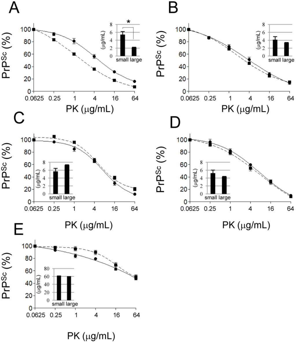 Comparison of the proteinase K (PK)-sensitivity of small and large PrPSc aggregates. Small (circle and solid line) and large (square and dashed line) PrPSc aggregates were treated with different concentrations of PK. The PrPSc signal intensity of each sample was compared to that of the 0.0625 μg/mL PK-treated sample, which showed the highest signal intensity. Dose-response curves from Chandler (A), mBSE (B), 22L (C), ME7 (D) and Tsukuba-2 (E) strains have been provided. The inset graphs indicate the concentration of PK that digested 50% of PrPSc ([PK]1/2). PrPSc was detected by mAb T2. Data represent the mean ± SEM of four independent experiments. The statistical significance of the difference in the [PK]1/2 of small and large PrPSc aggregates was assessed by Student’s t-test (*p < 0.01).