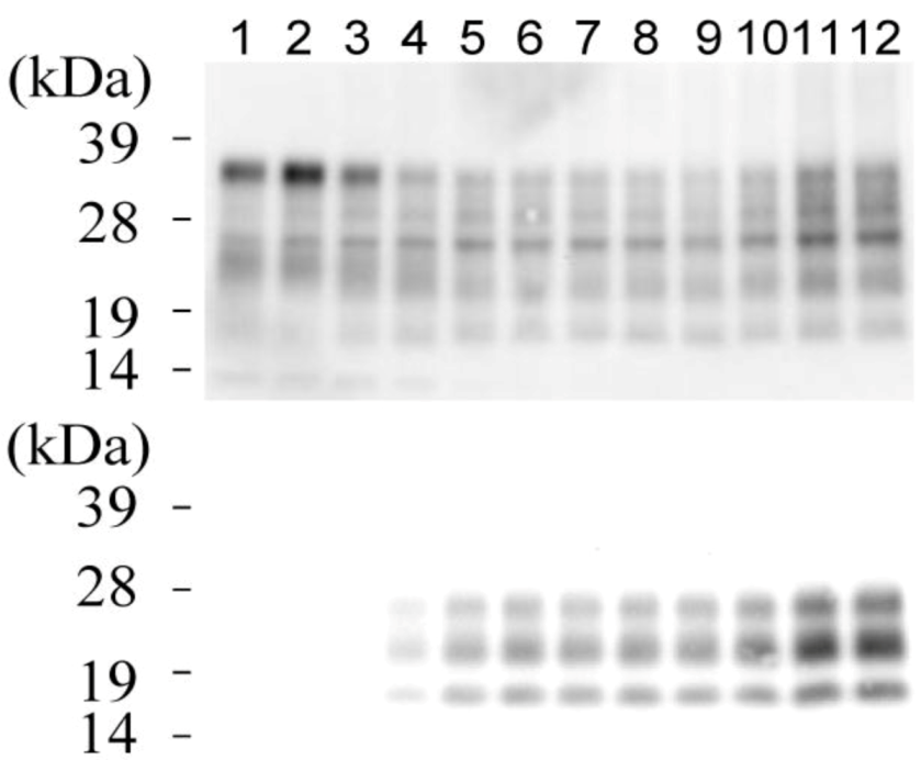 Brain homogenates of Chandler-affected mice were fractionated, and their PrP contents were analyzed by Western blotting. The total amounts of PrP in all fractions were normalized (upper panel), and then each fraction was treated with 4 μg/mL of PK at 37 °C for 30 min. After PK digestion, PrPSc was found in fractions 4–12 (lower panel). The molecular markers indicated are 39, 28, 19 and 14 kDa.